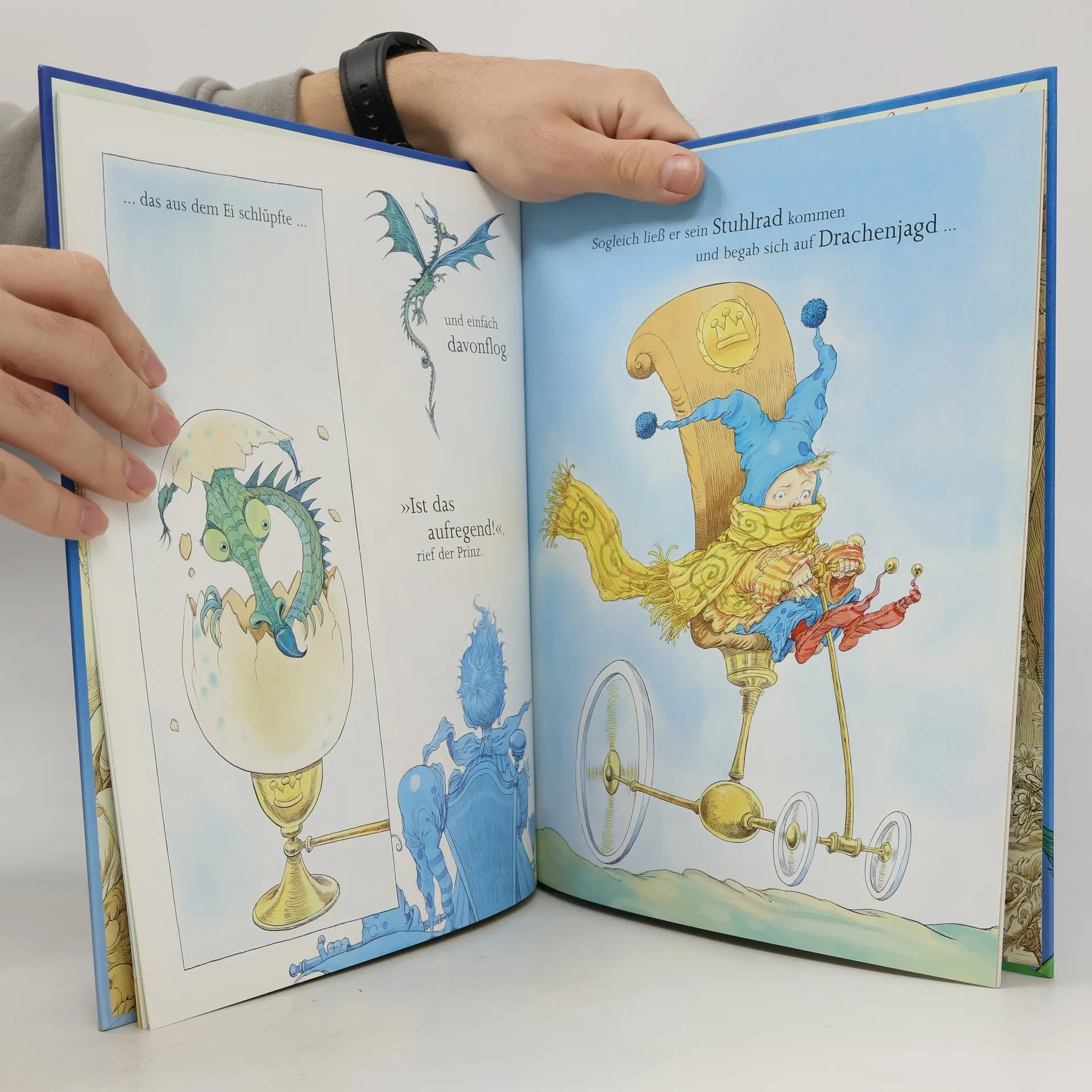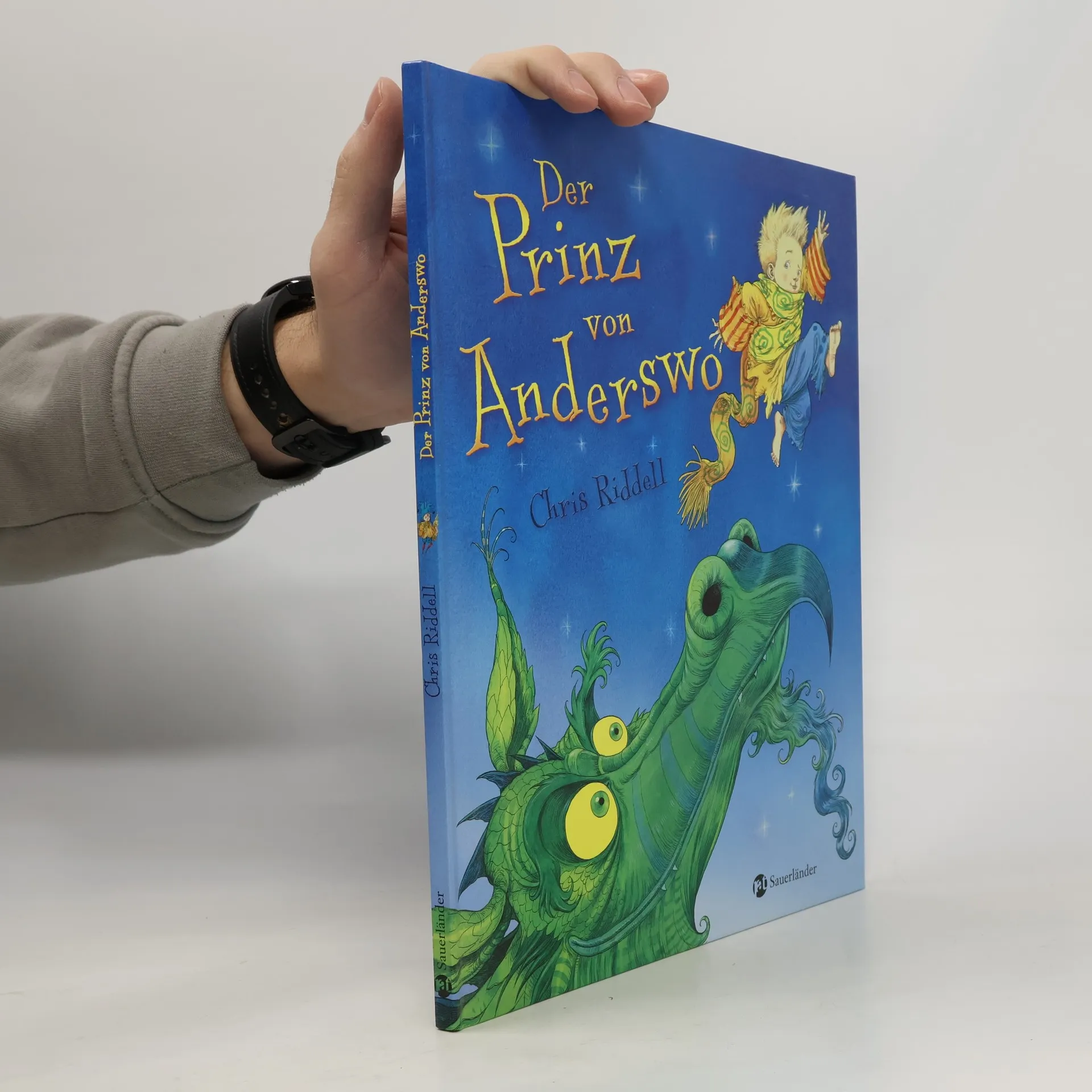 Der Prinz von Anderswo hat einen ungewöhnlichen Traum und fällt aus dem Bett. Sein Kleiderschrank hilft ihm, sich anzuziehen, doch sein Schnuffeltuch ist verschwunden. Auf der Suche gerät er in ein aufregendes Abenteuer mit einem Drachen, ähnlich wie im Klassiker „Wir gehen auf Bärenjagd“, und endet schließlich in seinem kuscheligen Bett.