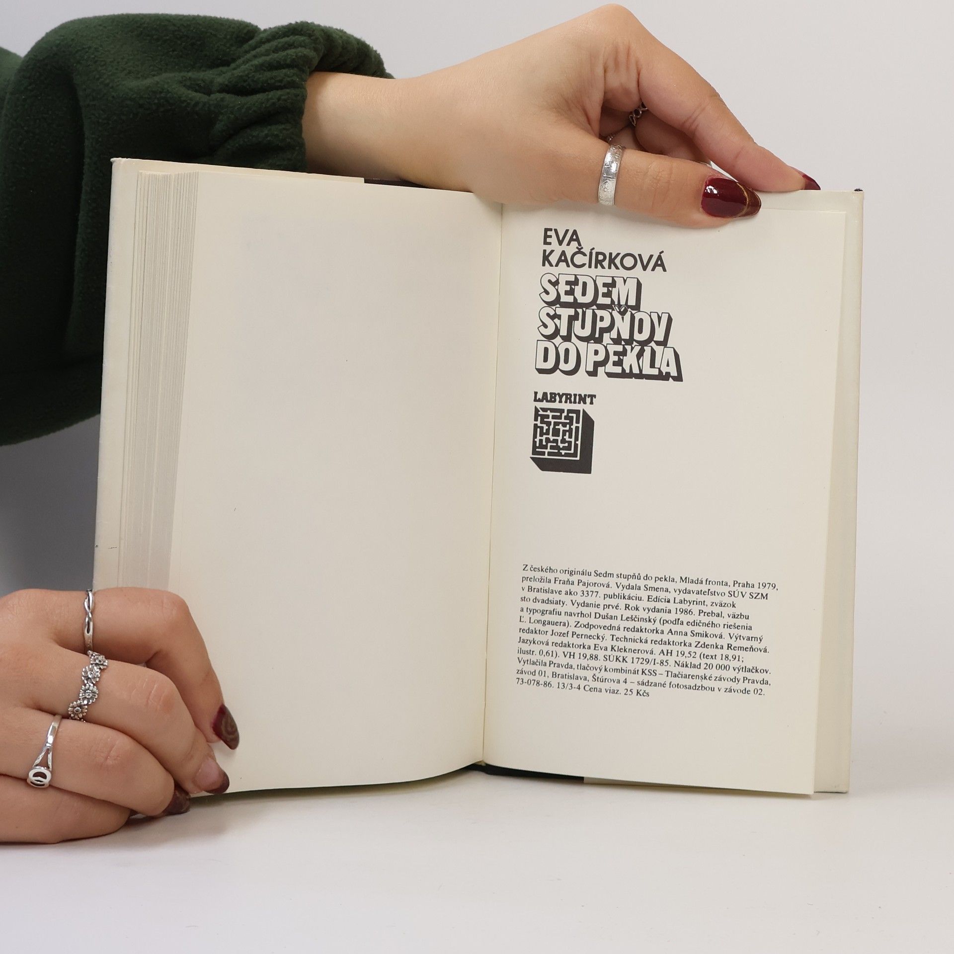 Kniha Evy Kačírkovej, súčasnej českej autorky, zahŕňa dve novely: Sedem stupňov do pekla a Predpoveď minulosti. Autorka, výborná fabulátorka a štylistka, drží čitateľa v napätí už od vstupných dramatických kapitol, i keď mu potom ponúka iba postupne, veľmi účinne, nečakanými zvratmi, o čo vlastne ide. Oba príbehy rozohráva v reálnom prostredí s reálnymi, nevyšpekulovanými ľuďmi so živým, hovorovým jazykom, neusiluje sa o násilne „zaujímavé" efekty, ale vždy zostáva na pôde skutočnosti, rovnako zaujímavej, vnášajúcej do deja presvedčivosť všedného dňa. Obe detektívne novely sú dobrou ukážkou súčasnej českej tvorby v oblasti žánru kriminálnych diel. Eva Kačírková je so svojimi knihami už známa a uznávaná autorka i v zahraničí, kde vyšli preklady niektorých jej románov. Mal by ju teda poznať i slovenský čitateľ.