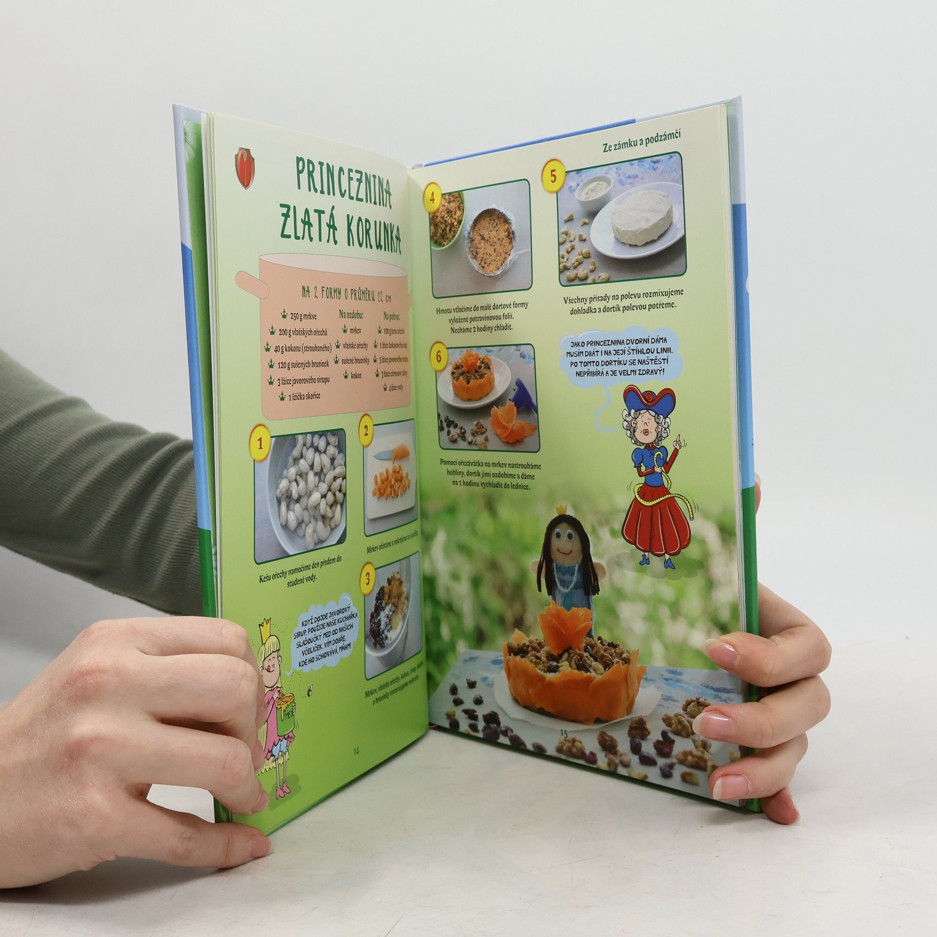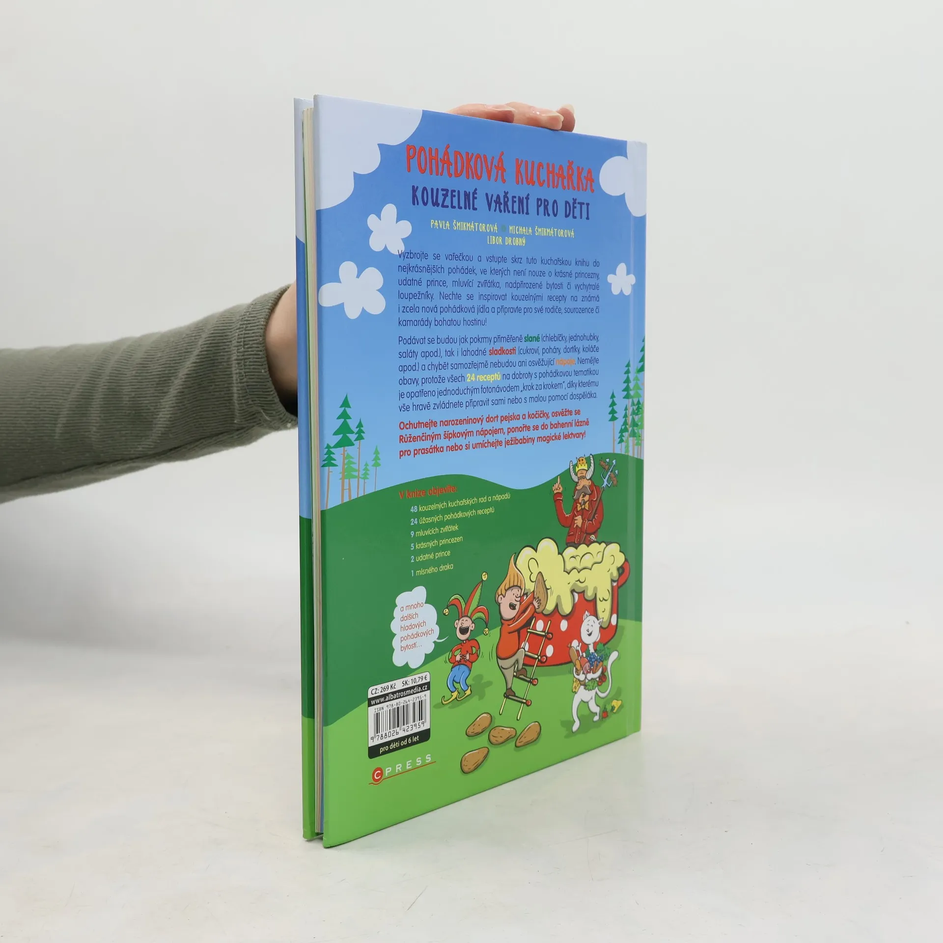 Vyzbrojte se vařečkou a vstupte skrz tuto kuchařskou knihu do nejkrásnějších pohádek, ve kterých není nouze o krásné princezny, udatné prince, mluvící zvířátka, nadpřirozené bytosti či vychytralé loupežníky. Nechte se inspirovat kouzelnými recepty na známá i zcela nová pohádková jídla a připravte pro své rodiče, sourozence či kamarády bohatou hostinu! Podávat se budou jak pokrmy přiměřeně slané (chlebíčky, jednohubky, saláty apod.), tak i lahodné sladkosti (cukroví, poháry, dortíky, koláče apod.) a chybět samozřejmě nebudou ani osvěžující nápoje. Nemějte obavy, protože všech 24 receptů na dobroty s pohádkovou tematikou je opatřeno jednoduchým fotonávodem „krok za krokem“, díky kterému vše hravě zvládnete připravit sami nebo s malou pomocí dospěláka. Ochutnejte narozeninový dort pejska a kočičky, osvěžte se Růženčiným šípkovým nápojem, ponořte se do bahenní lázně pro prasátka nebo si umíchejte ježibabiny magické lektvary! V knize objevíte: 48 kouzelných kuchařských rad a nápadů 24 úžasných pohádkových receptů 9 mluvících zvířátek 5 krásných princezen 2 udatné prince 1 mlsného draka a mnoho dalších hladových pohádkových bytostí…