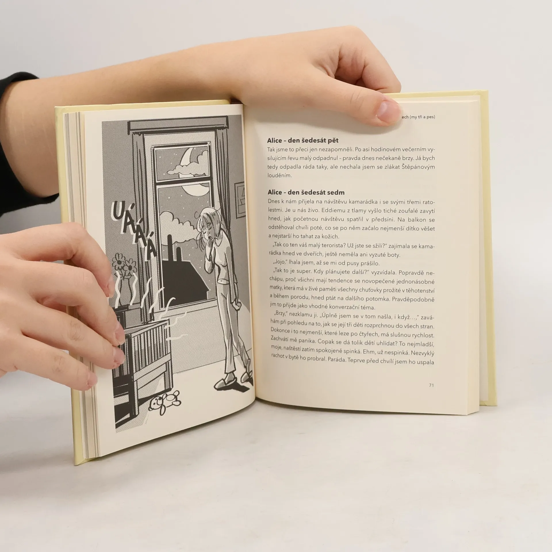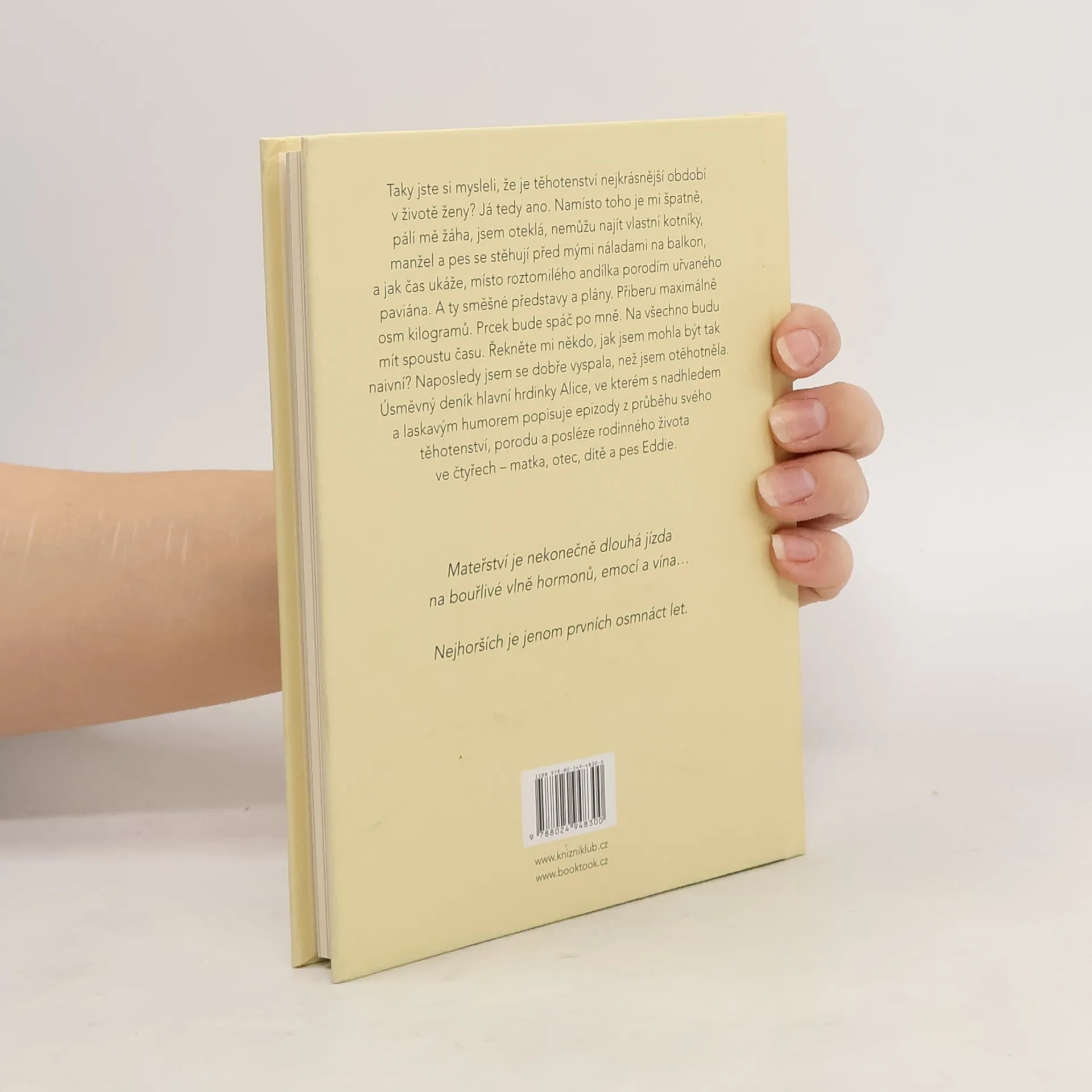 Taky jste si mysleli, že je těhotenství nejkrásnější období v životě ženy? Já tedy ano. Namísto toho je mi špatně, pálí mě žáha, jsem oteklá, nemůžu najít vlastní kotníky, manžel a pes se stěhují před mými náladami na balkon, a jak čas ukáže, místo roztomilého andílka porodím uřvaného paviána. A ty směšné představy a plány. Přiberu maximálně osm kilogramů. Prcek bude spáč po mně. Na všechno budu mít spoustu času. Řekněte mi někdo, jak jsem mohla být tak naivní? Naposledy jsem se dobře vyspala, než jsem otěhotněla. Úsměvný deník hlavní hrdinky Alice, ve kterém s nadhledem a laskavým humorem popisuje epizody z průběhu svého těhotenství, porodu a posléze rodinného života ve čtyřech – matka, otec, dítě a pes Eddie. Ilustroval Prokop Wilhelm.