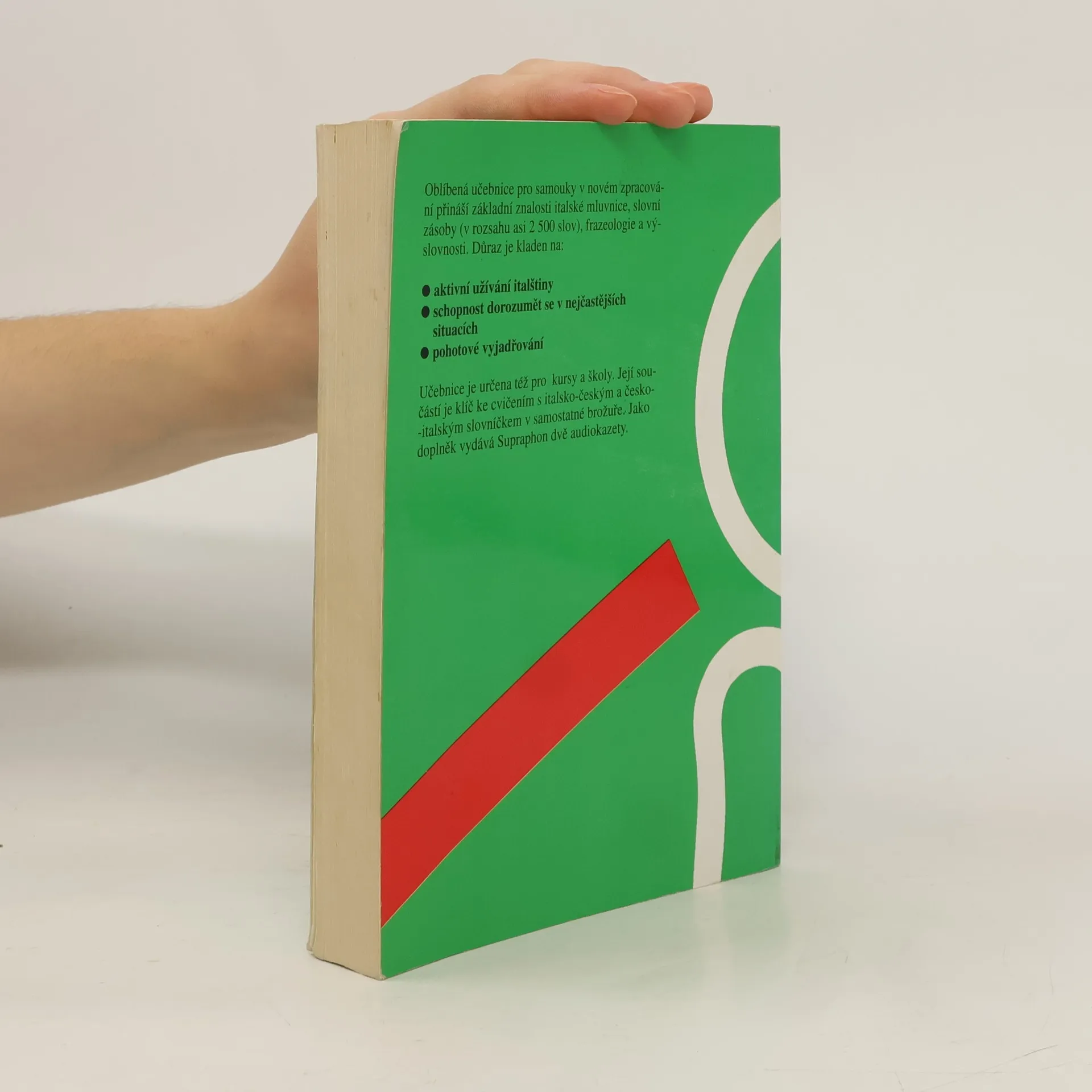 Oblíbená učebnice pro samouky v novém zpracování přináší základní znalosti italské mluvnice, slovní zásoby (v rozsahu asi 2500 slov ), frazeologie a výslovnosti. Důraz je kladen na: aktivní užívání italštiny schopnost dorozumět se v nejčastějších situacích pohotové vyjádřování Učebnice je určena též pro školy a kursy. Její součásti je brožura obsahující klíč ke cvičením s italsko-českým a česko-italským slovníčkem. Jako samostatný doplněk vydává Supraphon audionahrávku.... celý text