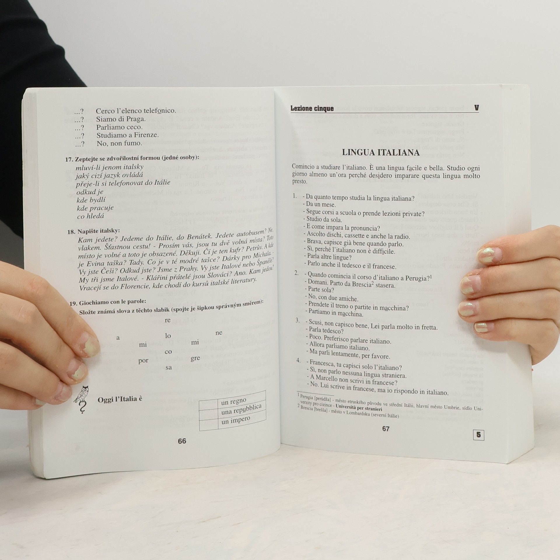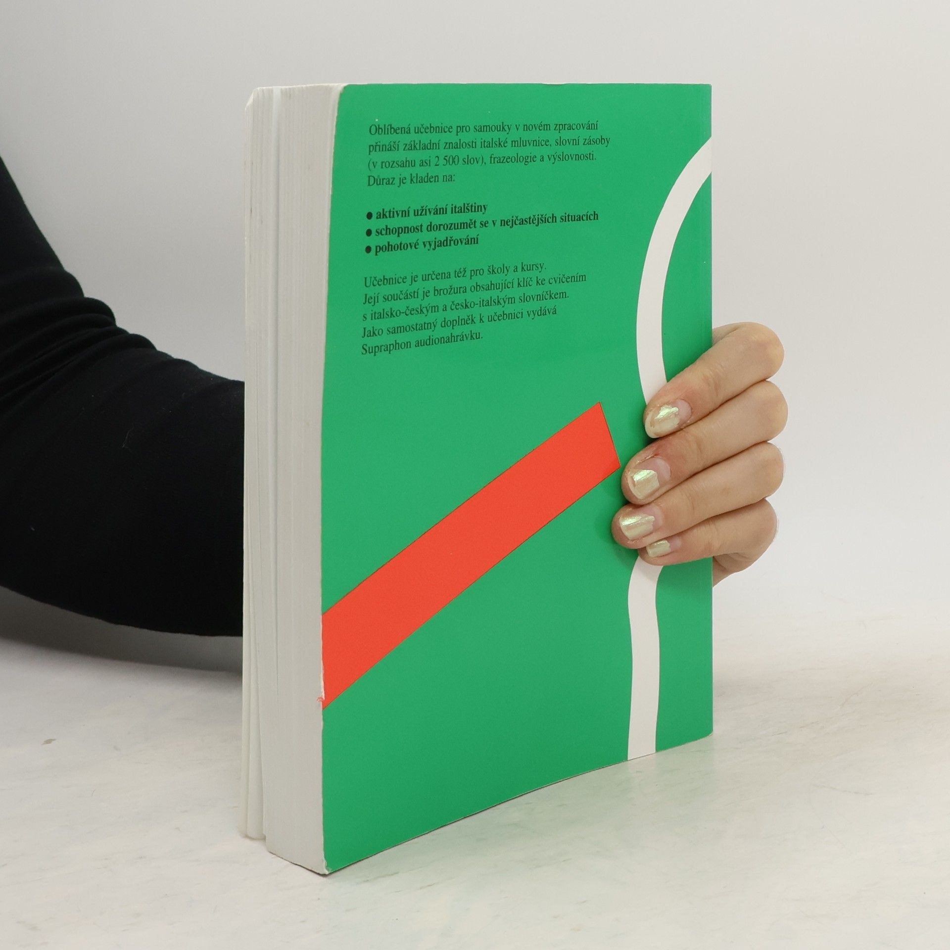 Oblíbená učebnice pro samouky v novém zpracování přináší základní znalosti italské mluvnice, slovní zásoby (v rozsahu asi 2500 slov ), frazeologie a výslovnosti. Důraz je kladen na: aktivní užívání italštiny schopnost dorozumět se v nejčastějších situacích pohotové vyjádřováníUčebnice je určena též pro školy a kursy. Její součásti je brožura obsahující klíč ke cvičením s italsko-českým a česko-italským slovníčkem. Jako samostatný doplněk vydává Supraphon audionahrávku.