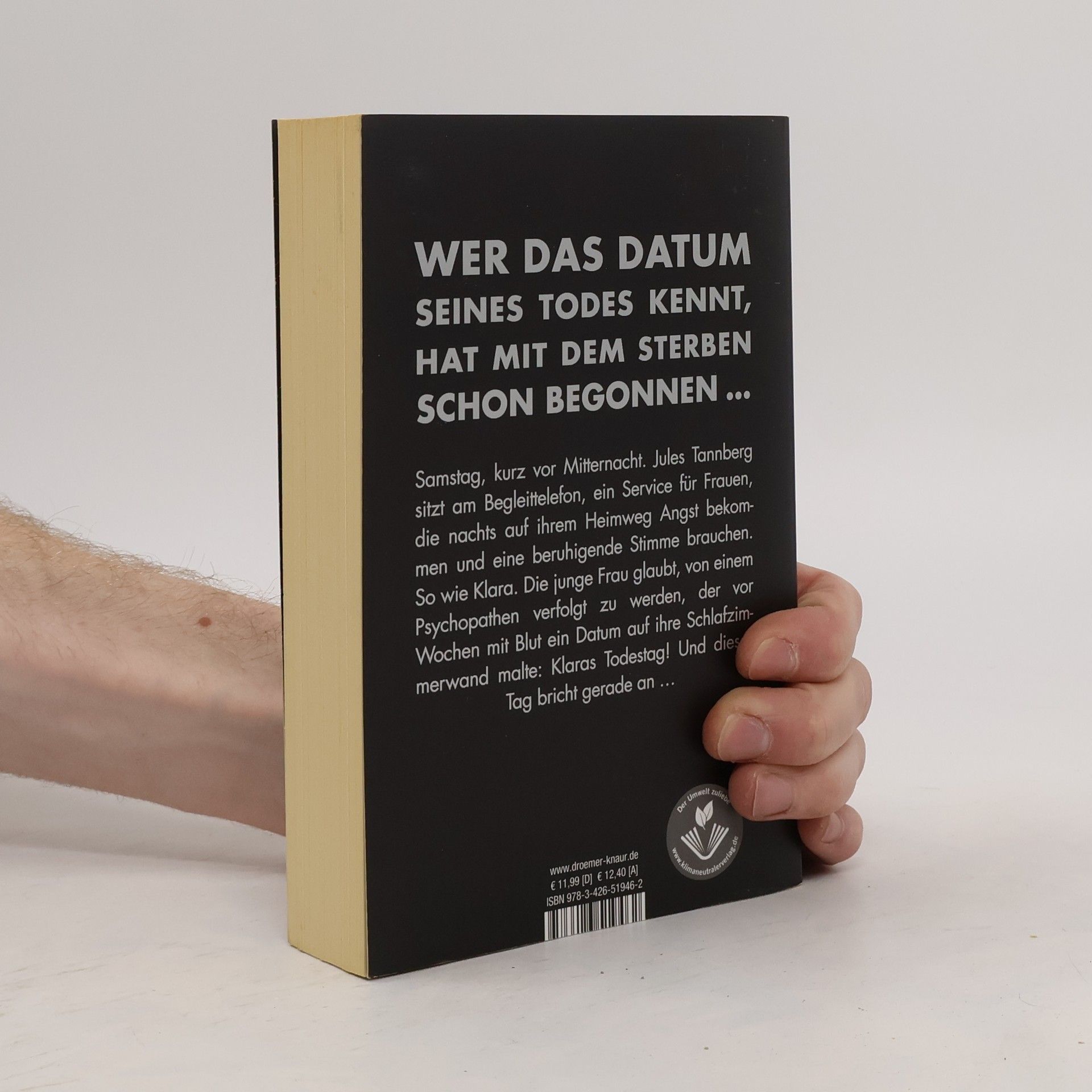 Wer das Datum seines Todes kennt, hat mit dem Sterben schon begonnen – dieser Bestseller von Sebastian Fitzek ist nichts für schwache Nerven! Es ist Samstag, kurz nach 22.00 Uhr. Jules Tannberg sitzt am Begleit-Telefon. Ein ehrenamtlicher Telefon-Service für Frauen, die zu später Stunde auf ihrem Heimweg Angst bekommen und sich einen telefonischen Begleiter wünschen, dessen beruhigende Stimme sie sicher durch die Berliner Nacht nach Hause führt - oder im Notfall Hilfe ruft. Noch nie gab es eine wirklich lebensgefährliche Situation. Bis heute, als Jules mit Klara spricht. Die junge Frau hat entsetzliche Angst. Sie glaubt, von einem Mann verfolgt zu werden, der sie schon einmal überfallen hat und der mit Blut ein Datum auf ihre Schlafzimmerwand malte: Klaras Todestag! Und dieser Tag bricht in nicht einmal zwei Stunden an ... Ein Serienmörder auf freiem Fuß – geheimnisvoll, beklemmend, nervenaufreibend: Einer der spannendsten Thriller aus der Feder des Bestsellerautors Sebastian Fitzek „Eines vermag dieser Autor wie kein Zweiter: eine Spannung aufzubauen, die zum Schluss schon fast als schmerzhaft empfunden wird.“ krimi-couch