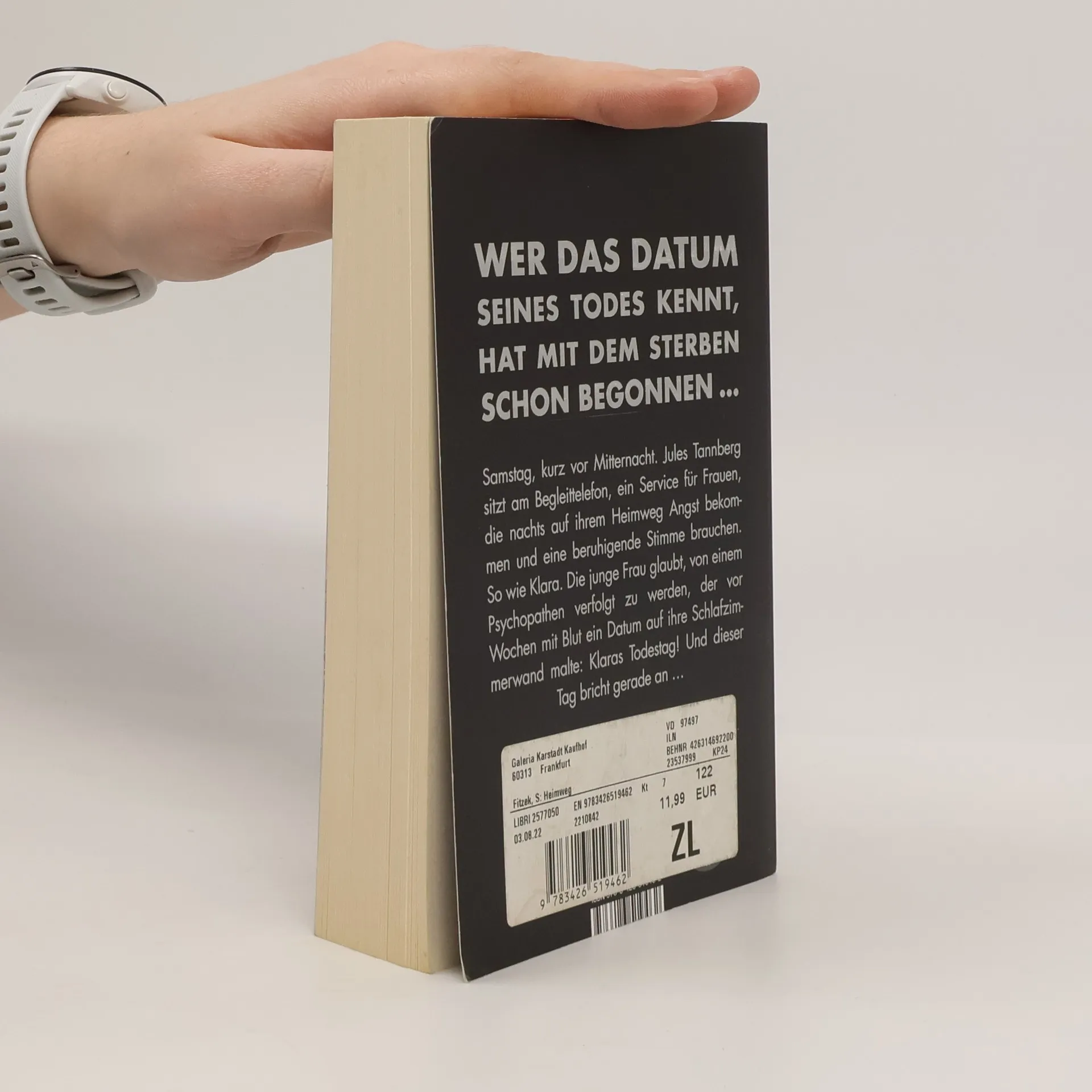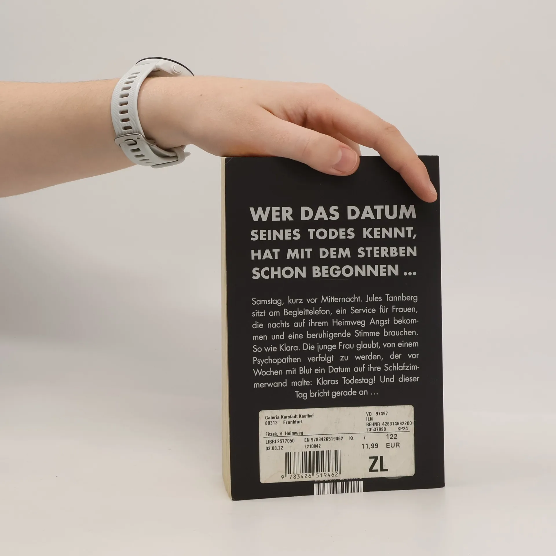 Wer das Datum seines Todes kennt, hat mit dem Sterben schon begonnen – dieser Bestseller von Sebastian Fitzek ist nichts für schwache Nerven! Es ist Samstag, kurz nach 22.00 Uhr. Jules Tannberg sitzt am Begleit-Telefon. Ein ehrenamtlicher Telefon-Service für Frauen, die zu später Stunde auf ihrem Heimweg Angst bekommen und sich einen telefonischen Begleiter wünschen, dessen beruhigende Stimme sie sicher durch die Berliner Nacht nach Hause führt - oder im Notfall Hilfe ruft. Noch nie gab es eine wirklich lebensgefährliche Situation. Bis heute, als Jules mit Klara spricht. Die junge Frau hat entsetzliche Angst. Sie glaubt, von einem Mann verfolgt zu werden, der sie schon einmal überfallen hat und der mit Blut ein Datum auf ihre Schlafzimmerwand malte: Klaras Todestag! Und dieser Tag bricht in nicht einmal zwei Stunden an ... Ein Serienmörder auf freiem Fuß – geheimnisvoll, beklemmend, nervenaufreibend: Einer der spannendsten Thriller aus der Feder des Bestsellerautors Sebastian Fitzek „Eines vermag dieser Autor wie kein Zweiter: eine Spannung aufzubauen, die zum Schluss schon fast als schmerzhaft empfunden wird.“ krimi-couch