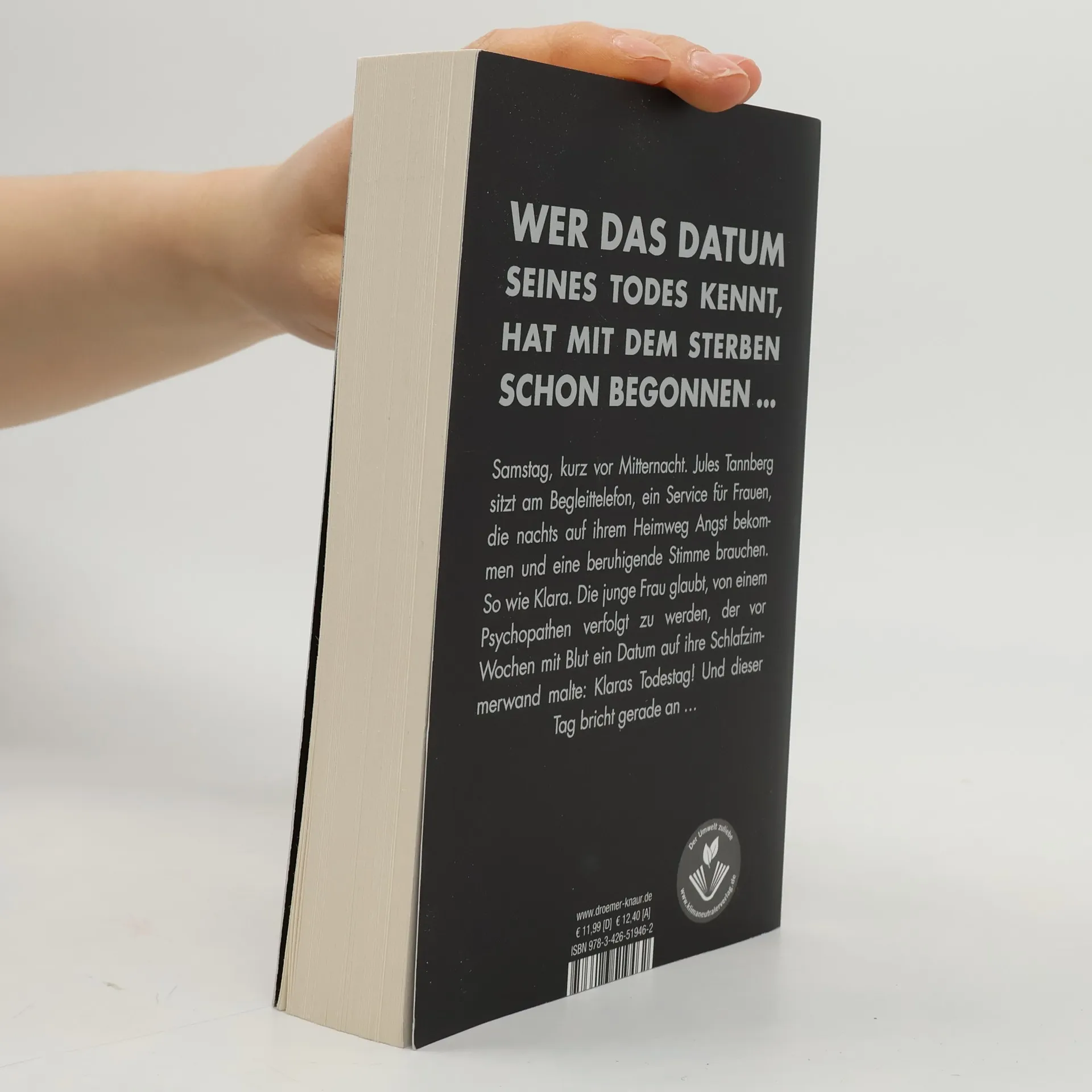 Wer das Datum seines Todes kennt, hat mit dem Sterben schon begonnen – dieser Bestseller von Sebastian Fitzek ist nichts für schwache Nerven! Es ist Samstag, kurz nach 22.00 Uhr. Jules Tannberg sitzt am Begleit-Telefon. Ein ehrenamtlicher Telefon-Service für Frauen, die zu später Stunde auf ihrem Heimweg Angst bekommen und sich einen telefonischen Begleiter wünschen, dessen beruhigende Stimme sie sicher durch die Berliner Nacht nach Hause führt - oder im Notfall Hilfe ruft. Noch nie gab es eine wirklich lebensgefährliche Situation. Bis heute, als Jules mit Klara spricht. Die junge Frau hat entsetzliche Angst. Sie glaubt, von einem Mann verfolgt zu werden, der sie schon einmal überfallen hat und der mit Blut ein Datum auf ihre Schlafzimmerwand malte: Klaras Todestag! Und dieser Tag bricht in nicht einmal zwei Stunden an ... Ein Serienmörder auf freiem Fuß – geheimnisvoll, beklemmend, nervenaufreibend: Einer der spannendsten Thriller aus der Feder des Bestsellerautors Sebastian Fitzek „Eines vermag dieser Autor wie kein Zweiter: eine Spannung aufzubauen, die zum Schluss schon fast als schmerzhaft empfunden wird.“ krimi-couch