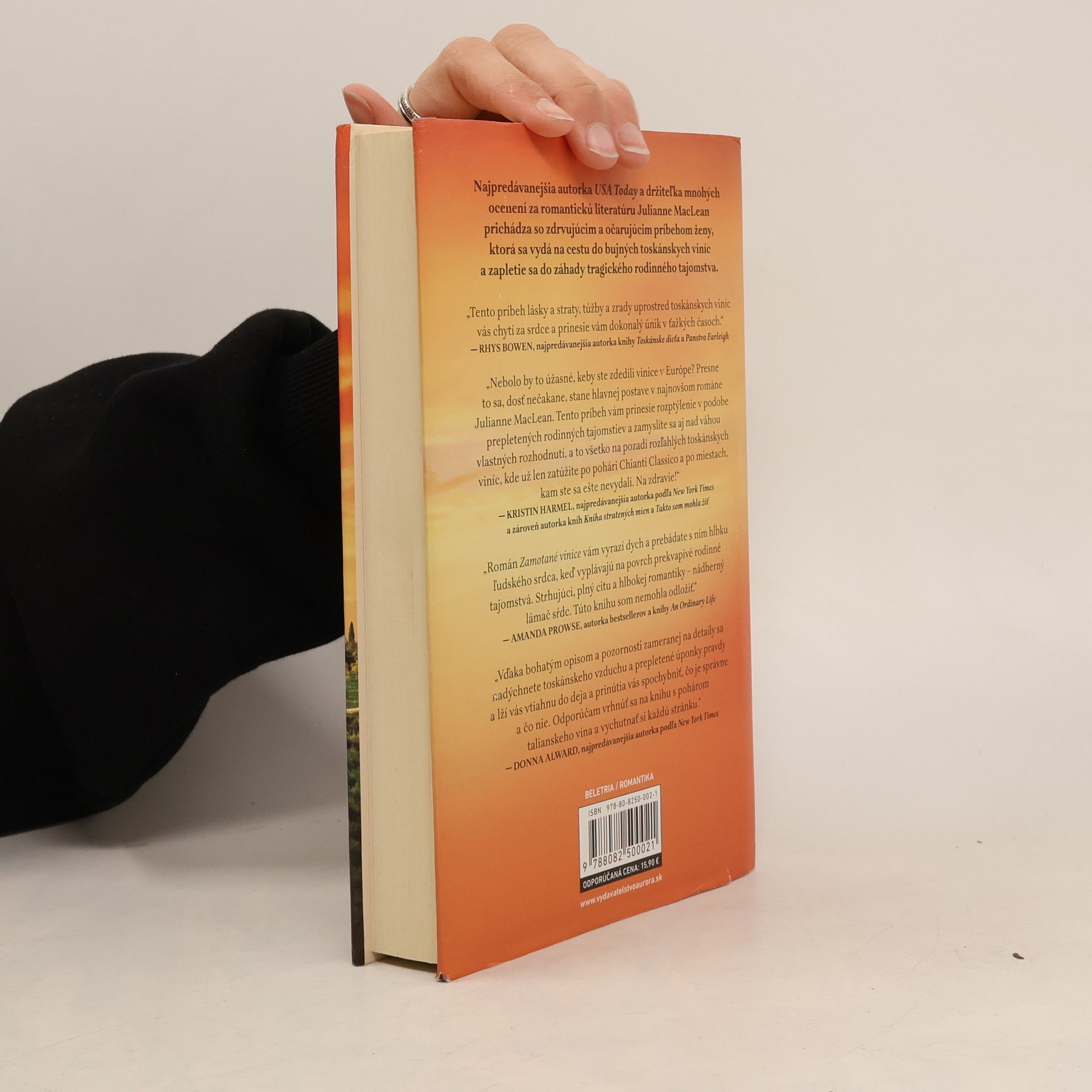 Najpredávanejšia autorka USA Today a ocenená spisovateľka romantickej literatúry Julianne MacLean prináša silný a očarujúci príbeh ženy, ktorá sa vydáva na cestu do toskánskych viníc a odhaľuje tragické rodinné tajomstvo. Fiona sa naučila udržiavať tajomstvá, najmä to, ktoré sa týka ľúbostného romániku jej matky pred tridsiatimi rokmi v Toskánsku. Keď jej právnička oznámi, že jej biologický otec zomrel a zanechal jej dedičstvo, Fiona sa ocitne v Taliansku, kde šokuje otcovu rodinu a vyvoláva napätie medzi nevlastnými súrodencami, ktorí sa snažia poprieť jej právo na podiel v dedičstve. Zatiaľ čo sa odhaľuje záhada matkinej aféry, Fiona čelí zložitým rodinným vzťahom a rivalite. Napriek strachu túži prijať svoj nový osud a hľadá pravdu o osudnom lete, ktoré jej mama strávila s otcom, ktorého nikdy nepoznala. Román je plný toskánskej romantiky a chutí, ponúkajúci srdcervúcu jazdu láskou, tajomstvami, odvahou a pravým zmyslom rodiny. Po vydaní sa kniha stala hitom medzi čitateľkami a získala popredné miesto medzi najpredávanejšími elektronickými knihami na Amazone.