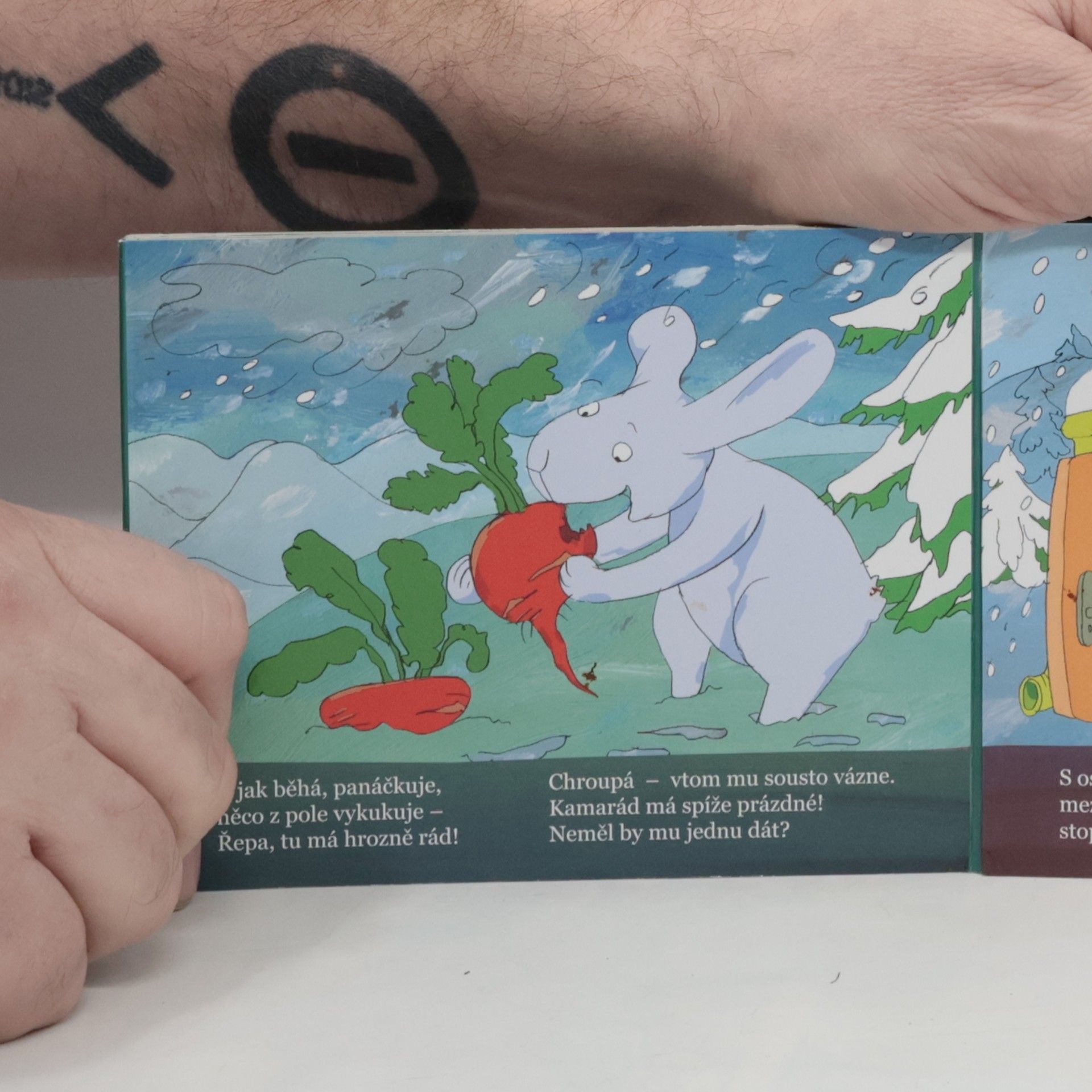 Zimní příběh zvířátek, která víc myslí na kamaráda než na sebe v těch časech, kdy je o dobrotu nouze. Zajíček najde dvě řepy zapomenuté v zasněženém poli. Jednu sní a druhou daruje oslíčkovi, ovšem tajně, jako překvapení...