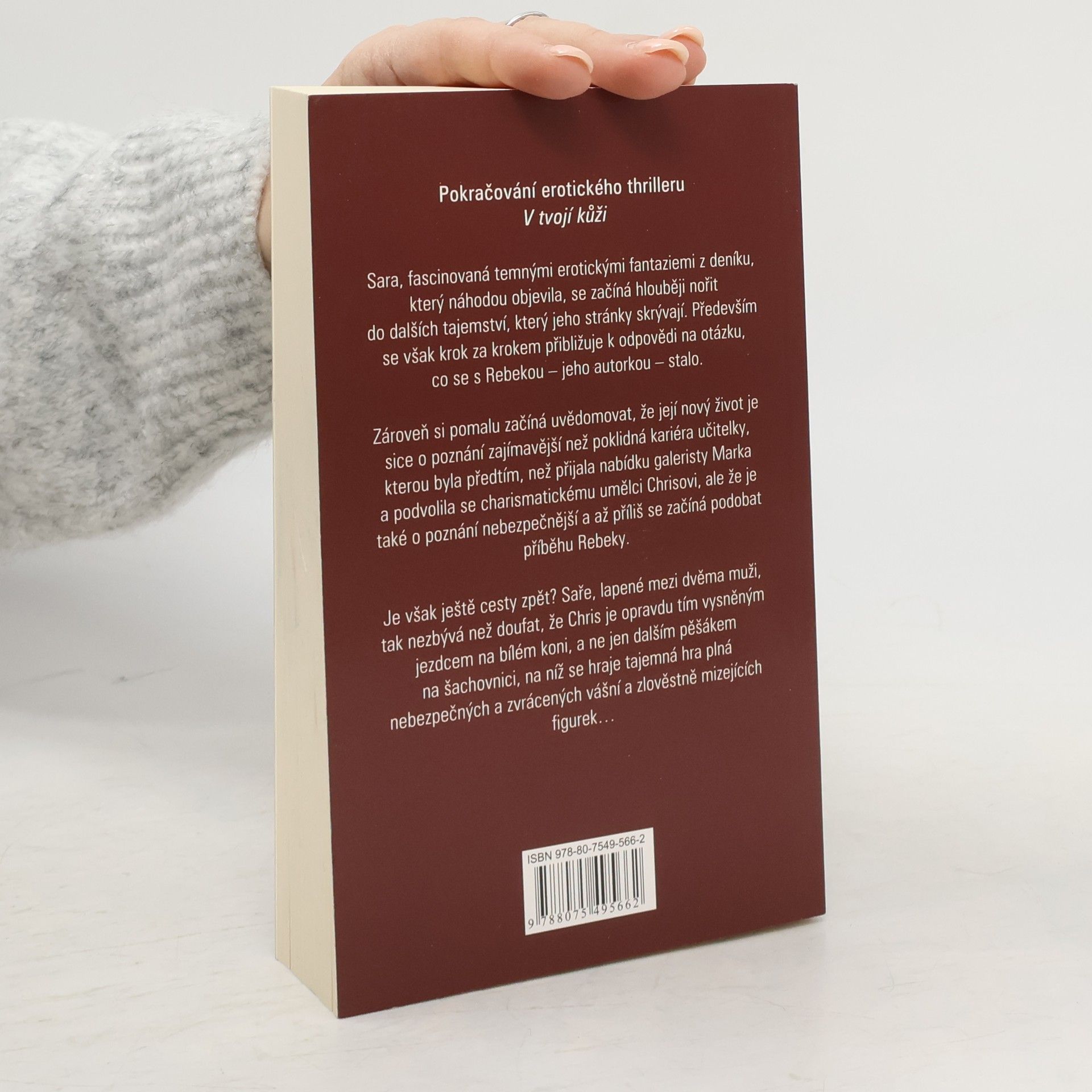 Fascinovaná temnými erotickými fantaziemi z deníku, který náhodou objevila, lapená mezi dvěma muži, které při pátrání po jeho autorce potkala, přibližuje se Sara krok za krokem k odpovědi na otázku, co se s Rebekou stalo. Zároveň si pomalu začíná uvědomovat, že její nový život je sice o poznání zajímavější než poklidná kariéra učitelky, kterou byla předtím, než přijala nabídku galeristy Marka a podvolila se charismatickému umělci Chrisovi, ale že je také o poznání nebezpečnější a že se až příliš začíná podobat příběhu Rebeccy. A ten je v očích Sary čím dál tím více zlověstně znepokojivý... Druhý díl celosvětově úspěšné erotické série, o níž američtí kritici říkají, že se v ní Padesát odstínů šedi potkává se Základním instinktem.