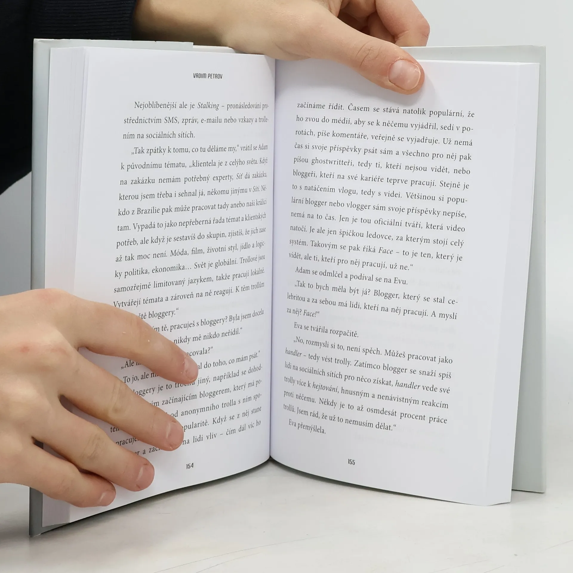 Román Vadima Petrova na aktuální téma virtuálních životů, kyberterorismu a fake news. Adam je představitel internetové generace. Také je programátor, počítačový hacker a aktivista. Je přesvědčený, že dosavadní společenská pravidla musí skončit a nahradí je jiná. Internet a volný přístup všech a ke všemu k tomu dává jedinečnou příležitost. Ne všechny z jeho generace to trápí, život nabízí tolik jiných povyražení než měnit svět, ale je to jedna ze zábavných možností. Adamova přítelkyně Eva má například o životě zcela jinou představu. Daniel je čerstvý důchodce. Snaží se ještě nějak chytit. Jenže pracovní trh potřebuje mladé lidi, kteří dokážou přepínat mezi reálným a virtuálním světem automaticky, bez přemýšlení. Navíc Daniel cítí, jak mu ubývá energie. Dost sil ho stojí, aby se přicházejícímu stáří ubránil a přirozený úpadek organismu zpomalil. Jeho o dost mladší partnerka Clare věnovala veškerý čas kariéře a životnímu stylu bez dětí. Velkou rodinu ale vždycky chtěla. Má poslední příležitost něco s tím udělat. Posledním z hlavních hrdinů je Wang. Životní tragédie mu změnila pohled na svět. Stal se vnímavější. Ti všichni mají silnou touhu po životní změně. Jen potřebují impulz.