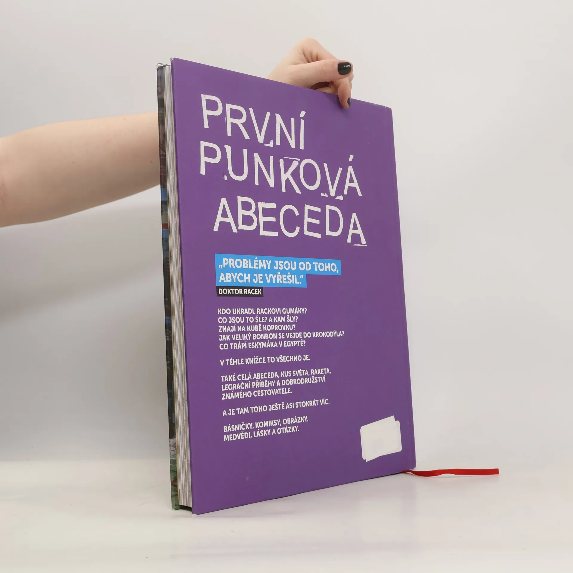 První punková abeceda Doktor Racek sedá do rakety a vydává se na cestu kolem zeměkoule. Navštěvuje různé kouty světa a děti se při tom učí písmena. Kniha jako gejzír nápadů vedle hravé formy obsahuje i vzdělávací prvky. Básničky, komiksy, koláže, krátké pohádky, hry, otázky a úkoly. Pro všechny děti a jejich skvělé rodiče. Nikdo se nebude ani vteřinu nudit! Kdo ukradl Rackovi gumáky? Co jsou šle? A kam šly? Znají na Kubě koprovku? Jak veliký bonbon se vejde do krokodýla? Co trápí Eskymáka v Egyptě? V téhle knížce je všechno – celá abeceda, kus světa, raketa, legrační příběhy a dobrodružství známého cestovatele.