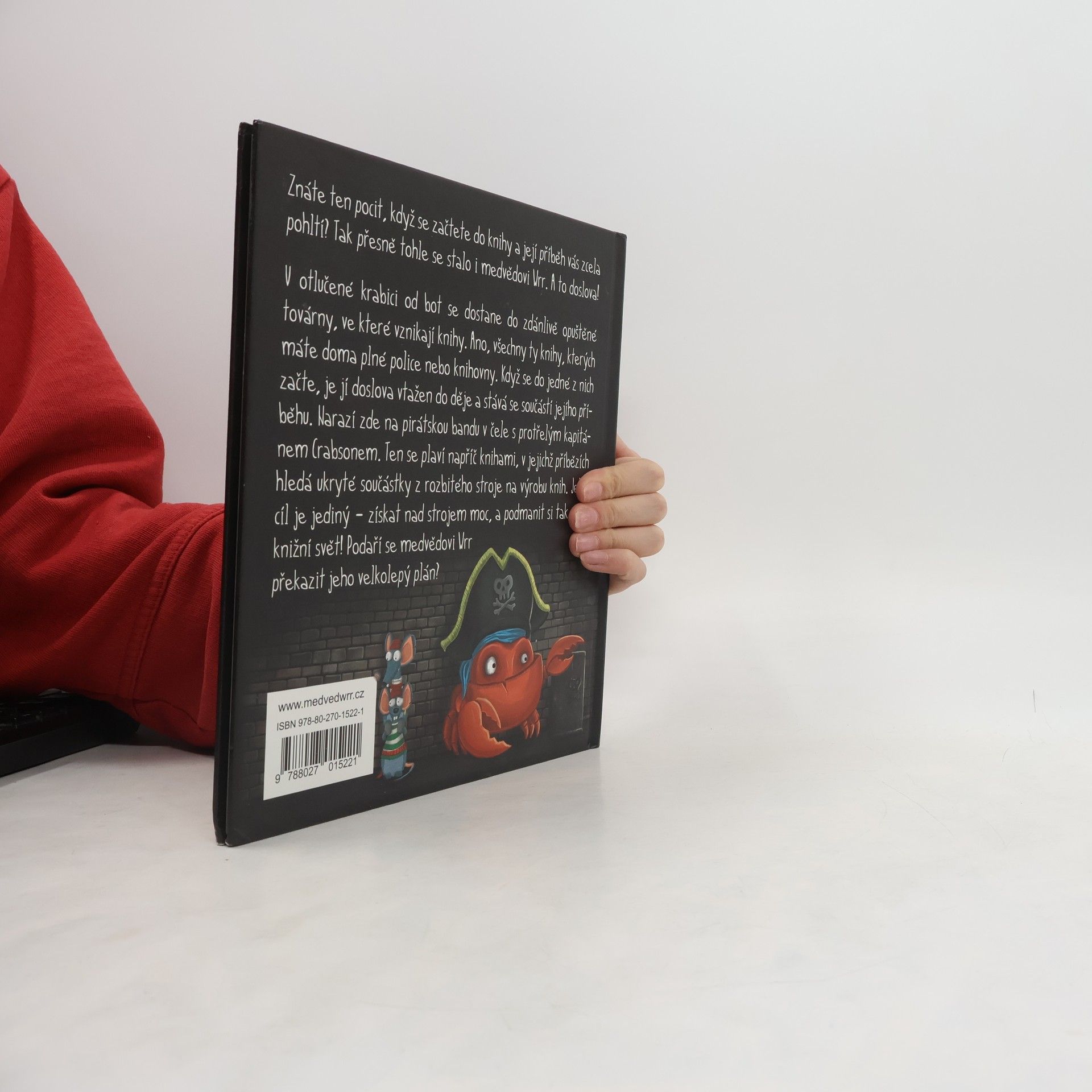 O čem kniha vypráví: "Znáte ten pocit, když se začtete do knihy a její příběh Vás zcela pohltí? Tak přesně tohle se stalo i medvědovi Wrr. A to doslova! V otlučené krabici od bot se dostane do zdánlivě opuštěné továrny, ve které vznikají knihy. Ano, všechny ty knihy, kterých máte doma plné police nebo knihovny. Když se do jedné z nich začte, je doslova vtažen do děje a stává se součástí jejího příběhu. Narazí zde na pirátskou bandu v čele s protřelým kapitánem Crabsonem. Ten se plaví napříč knihami, v jejichž příbězích hledá ukryté součástky z rozbitého stroje na výrobu knih. Jeho cíl je jediný – získat nad vynálezem moc a podmanit si tak celý knižní svět! Podaří se medvědovi Wrr překazit jeho ničemný plán?"
