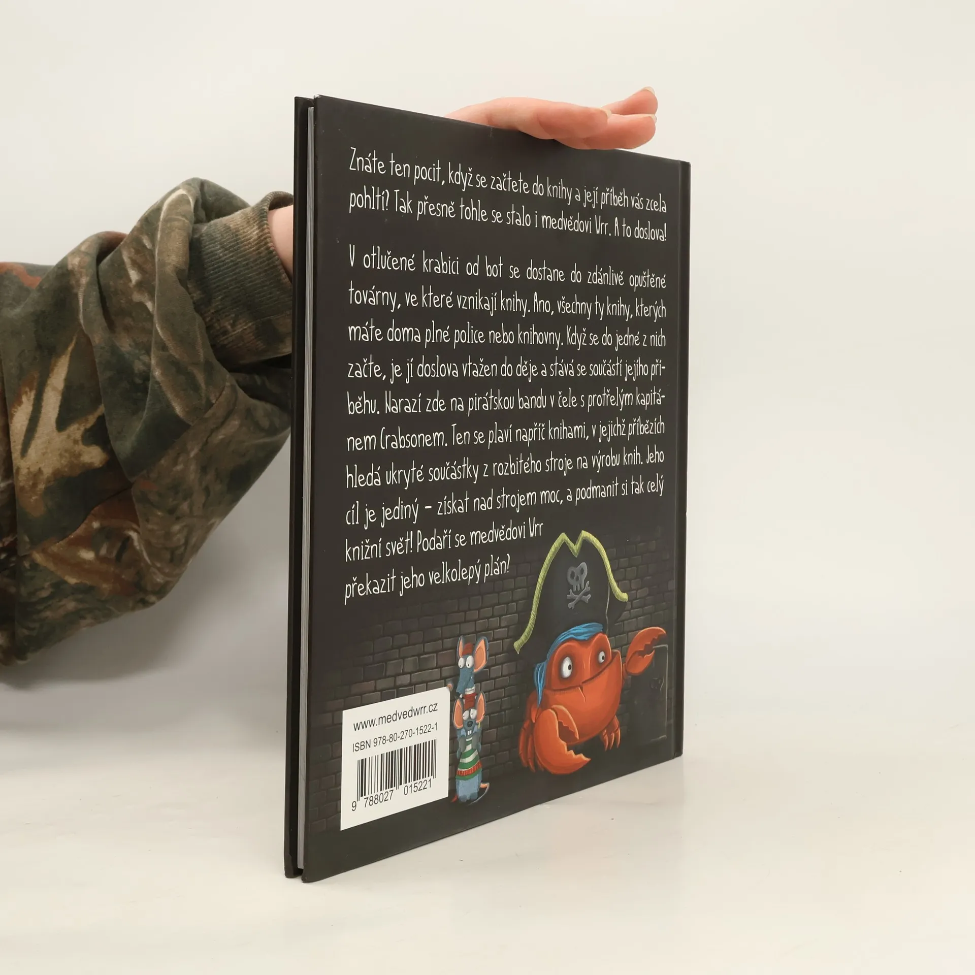 O čem kniha vypráví: "Znáte ten pocit, když se začtete do knihy a její příběh Vás zcela pohltí? Tak přesně tohle se stalo i medvědovi Wrr. A to doslova! V otlučené krabici od bot se dostane do zdánlivě opuštěné továrny, ve které vznikají knihy. Ano, všechny ty knihy, kterých máte doma plné police nebo knihovny. Když se do jedné z nich začte, je doslova vtažen do děje a stává se součástí jejího příběhu. Narazí zde na pirátskou bandu v čele s protřelým kapitánem Crabsonem. Ten se plaví napříč knihami, v jejichž příbězích hledá ukryté součástky z rozbitého stroje na výrobu knih. Jeho cíl je jediný – získat nad vynálezem moc a podmanit si tak celý knižní svět! Podaří se medvědovi Wrr překazit jeho ničemný plán?"