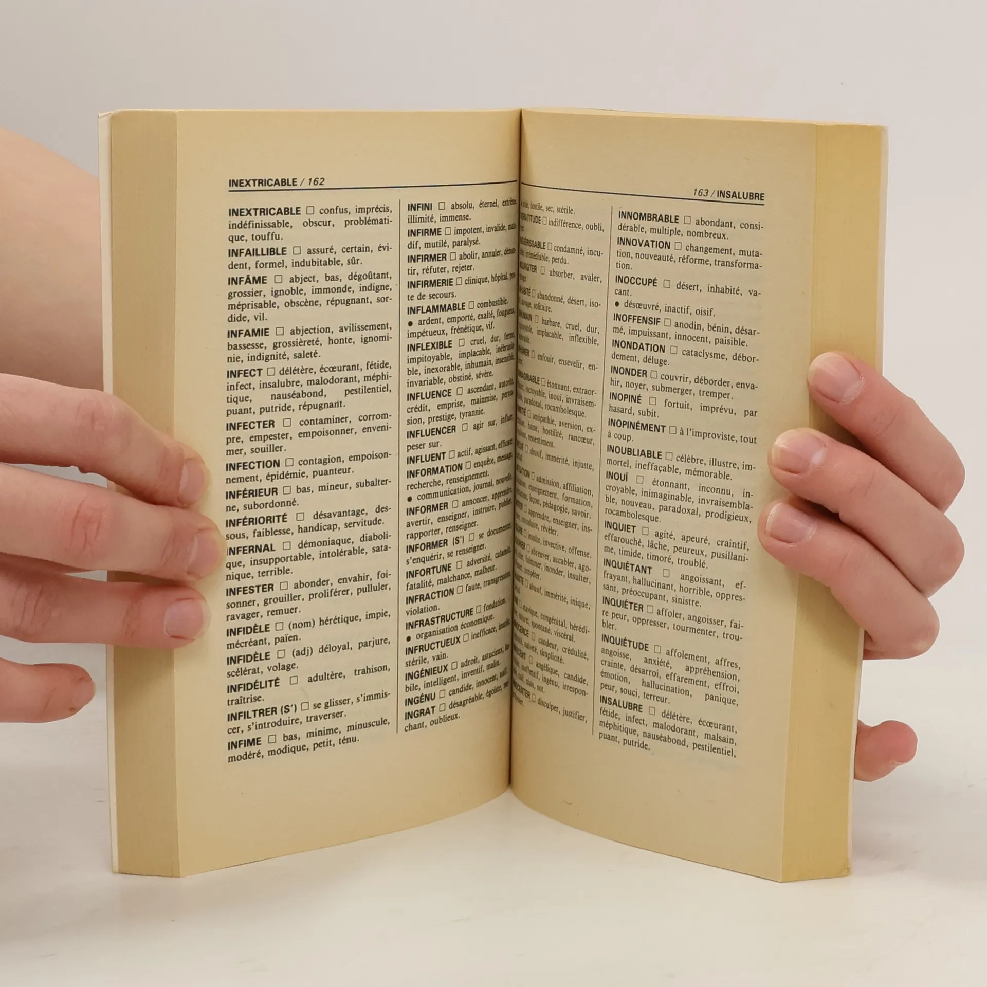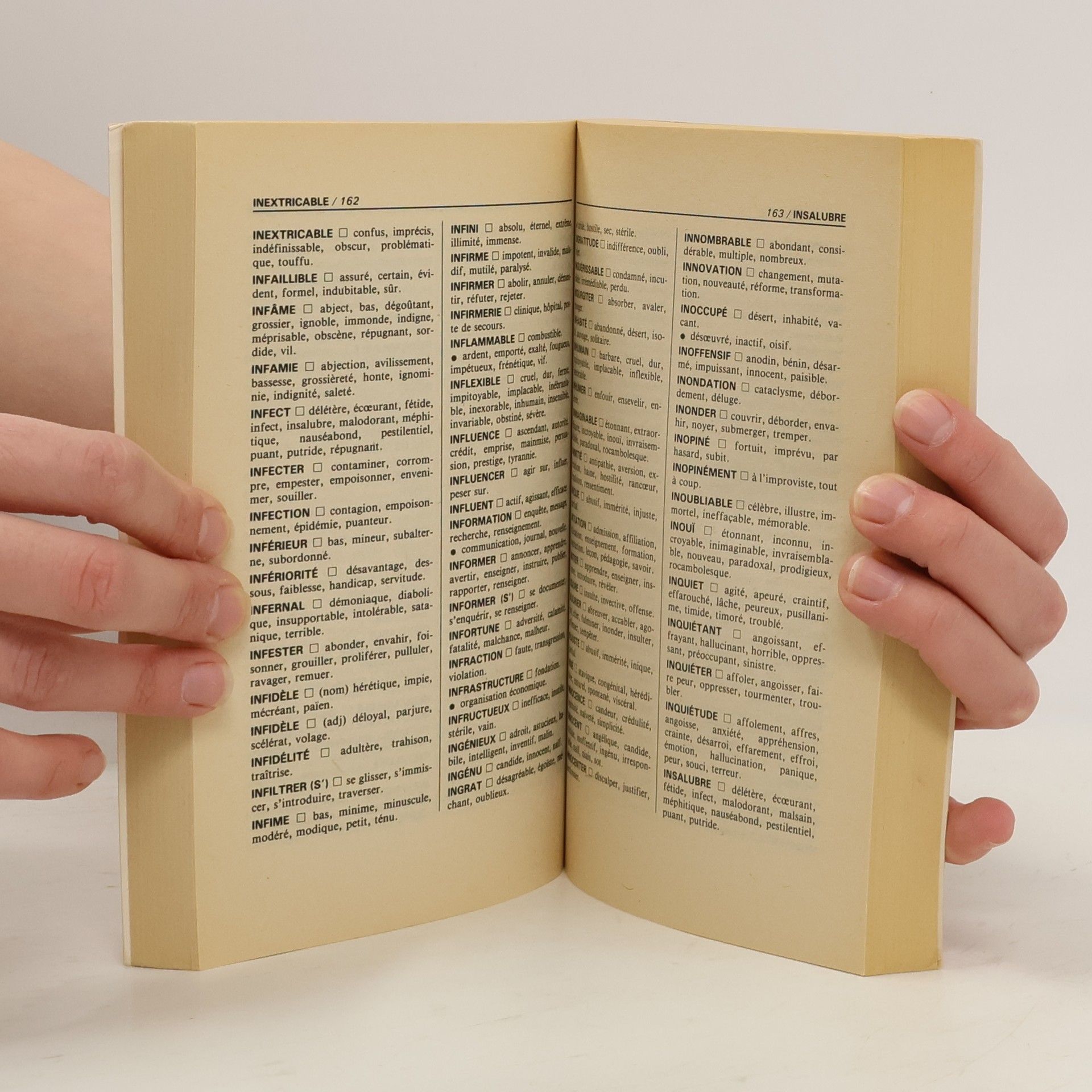 La langue française n'aime pas les redites. Pour avoir du style, dans son écriture, il faut éviter les répétitions. D'où la nécessité d'un dictionnaire des synonymes. Mais le synonyme est aussi utile pour trouver le mot "juste", exact, celui qui permet de graduer ses sentiments, de préciser sa pensée, de donner de l'intensité, et de la fermeté, à ses écrits, qu'ils soient privés ou professionnels. Ce Dictionnaire des synonymes a été conçu pour un usage rapide, immédiat : pas de renvois sur d'autres pages, d'autres rubriques, pas de références étymologiques ou de termes tombés en désuétude. Moderne dans le choix des termes, efficace dans son utilisation, il permet de trouver sans perte de temps des équivalents appropriés aux mots-clés de la langue française.