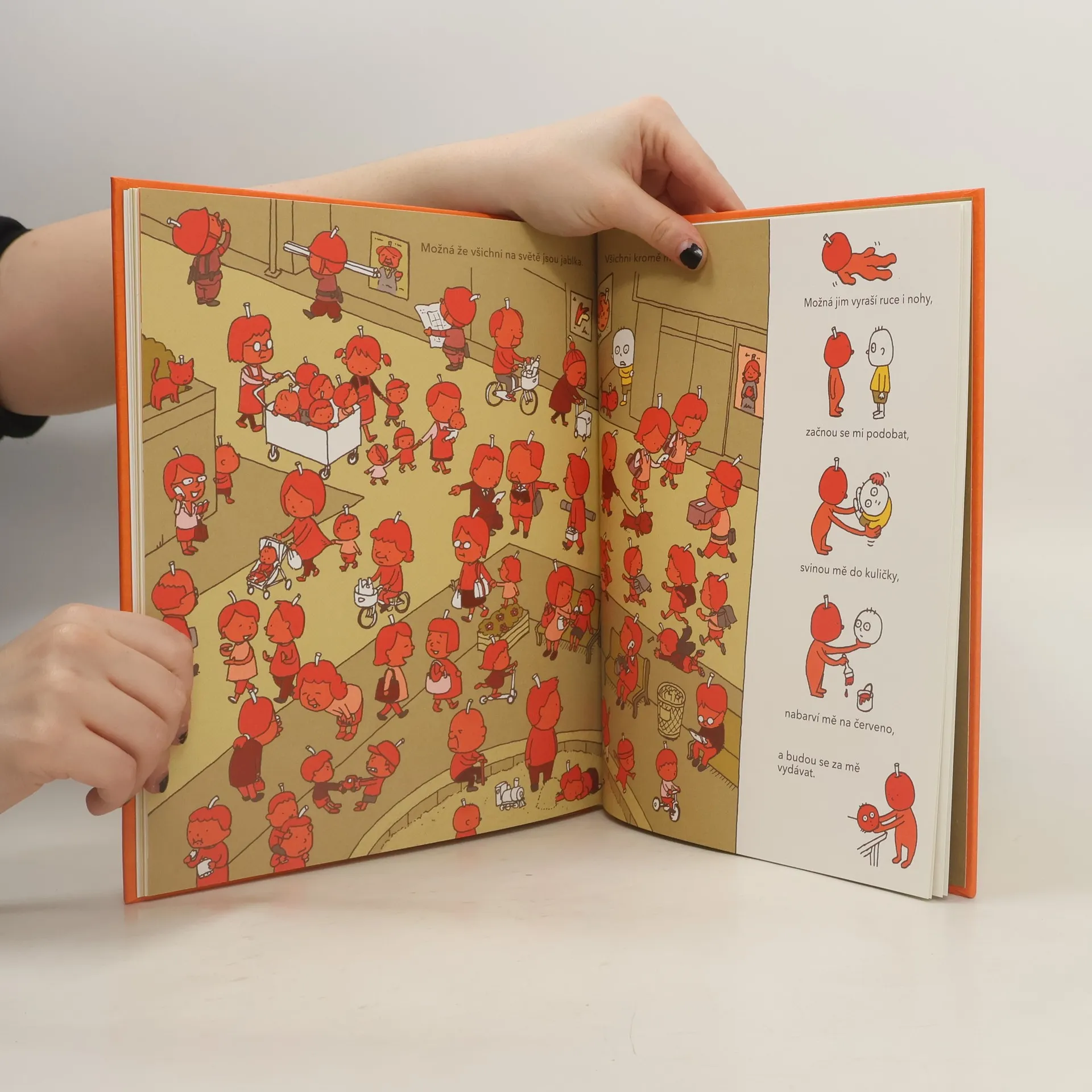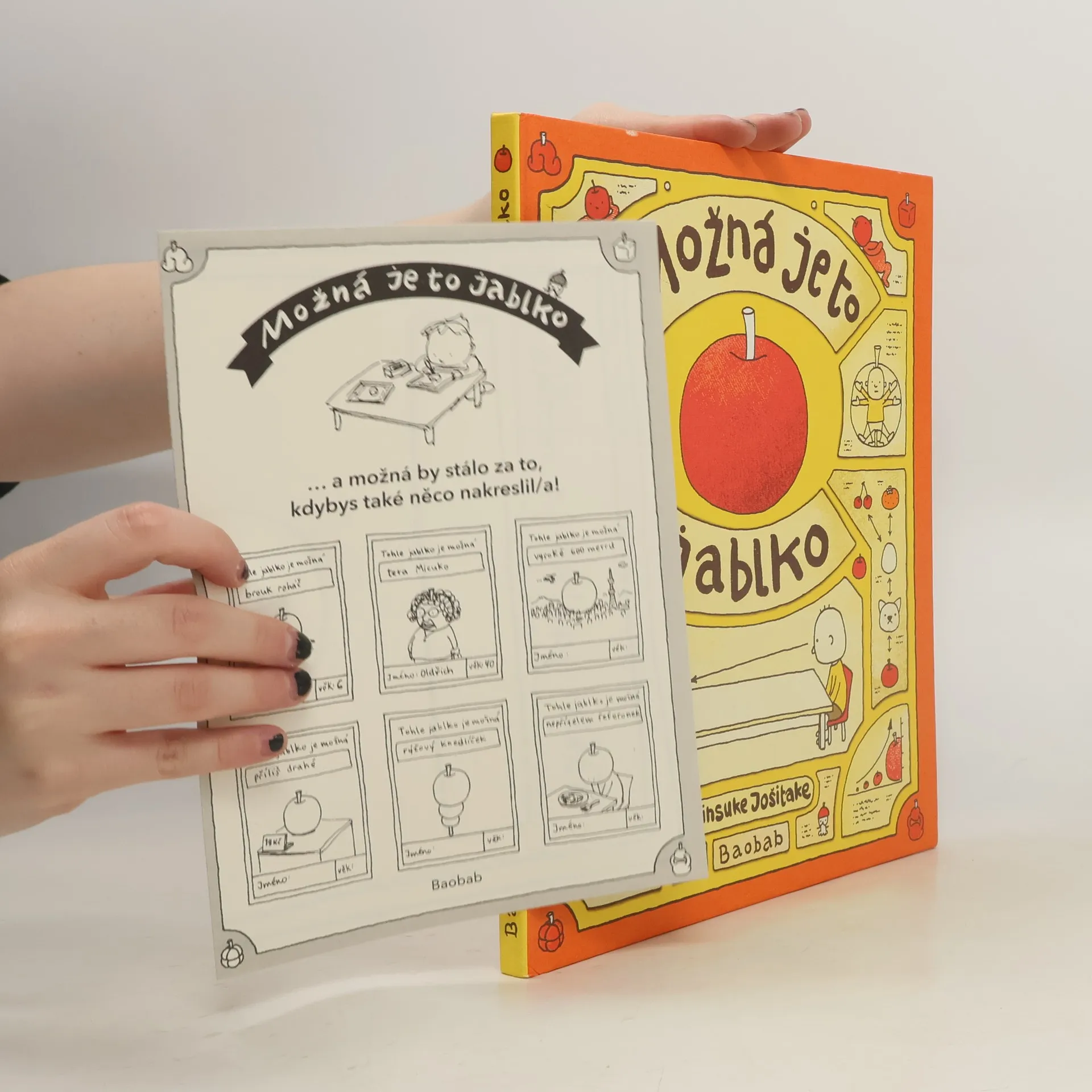 V kuchyni na stole leží krásné jablko. Je to opravdu jablko? ptá se malý kluk, když přijde domů. Nemohlo by to být něco jiného? A co to asi bude? Proč jsou některé věci jiné uvnitř a jiné venku? Co by se stalo se mnou, s maminkou, se světem, kdyby jablko nebylo jablko? Jsou období, kdy nás děti zavalují otázkami, některé se nám zdají legrační, jiné směšné, jiné nedůležité. Děti to nerozlišují a nechávají se unést představami. Někdy se ptají, protože mají strach, jindy proto, že jsou urputné nebo popustí uzdu fantazii, ale často otázkami nahlížejí pod povrch světa dospělých, kteří na otázky nemají čas. Přitom každá otázka nás může zavést do neprobádaných končin, když o ní začneme pořádně přemýšlet. Proč by jablko nemohlo být dům nebo dům jako jablko, proč by viditelný svět měl být stejný jako ten neviditelný? Knížka Možná je to jablko japonského kreslíře a autora Šinsuke Jošitakeho je vtipná a chytrá zároveň: jako všechny zvědavé děti a filozofové.