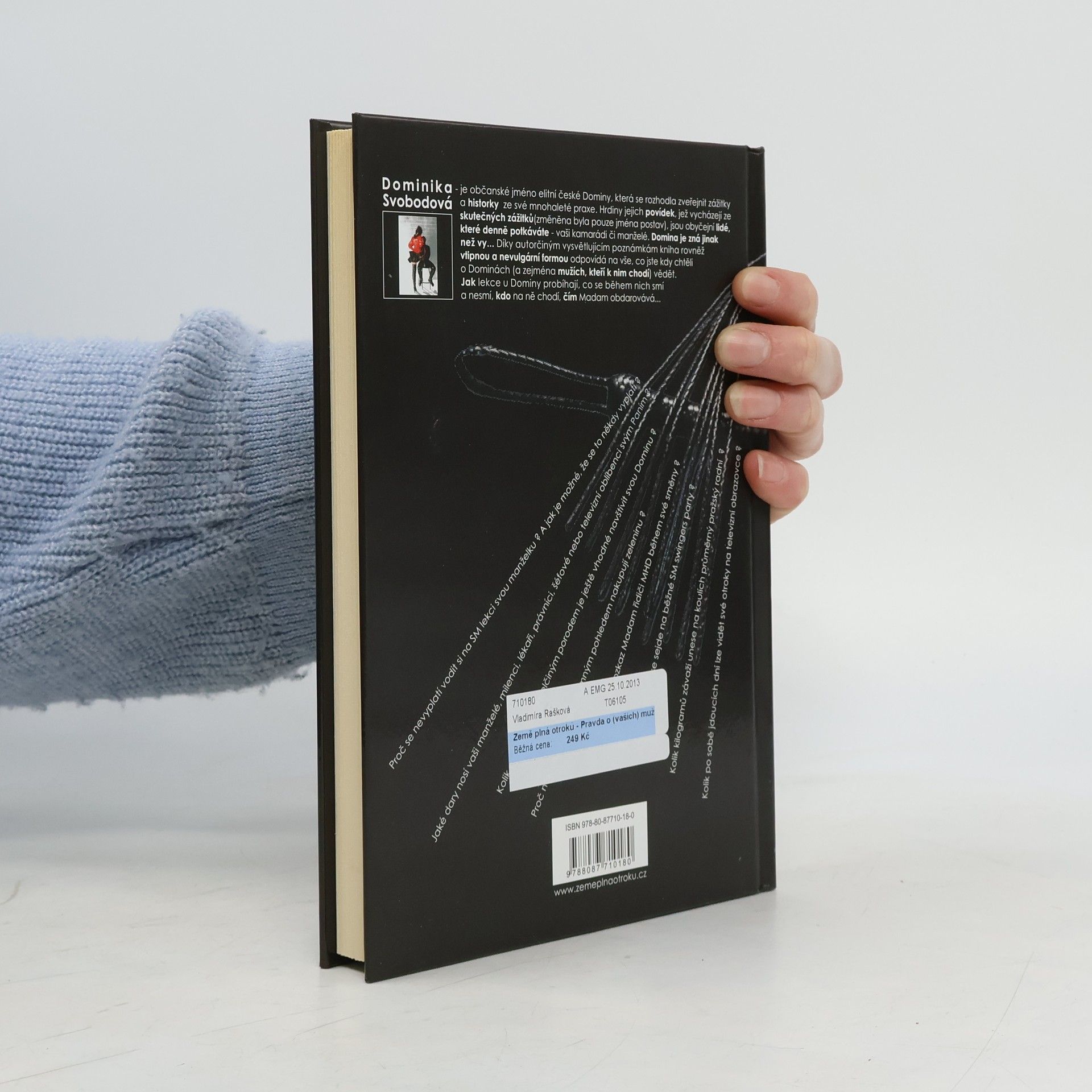 Dominka Svobodová je elitní česká Domina, která se rozhodla zveřejnit zážitky a historky ze své mnohaleté praxe. Hrdiny její knihy, vycházející ze skutečných zážitků (změněna byla jen jména postav), jsou obyčejní lidé, jež denně potkáváte – vaši kamarádi či manželé.