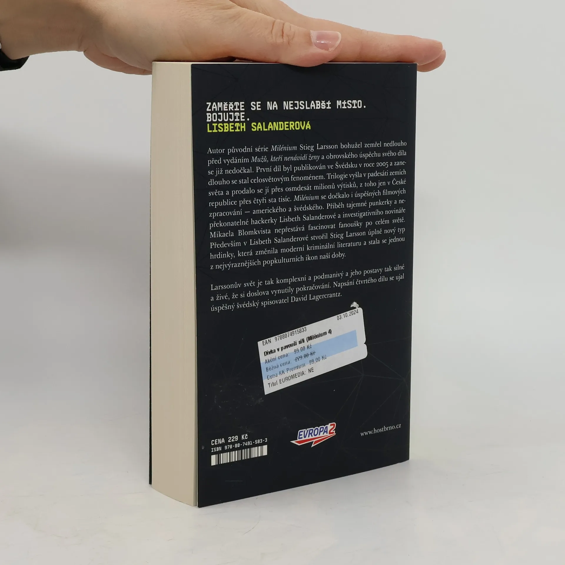 Trilogie Stiga Larssona Milénium byla skvělá a přečetl jsem ji jedním dechem. Proto jsem byl zvědavý, jak se s pokračováním úspěšné série vypořádá jiný autor, tedy David Lagercrantz. Měl jsem obavy, že téma zkazí, jak to tak bývá často ve snaze vytěžit maximum z úspěšného díla. Ale zvědavost zvítězila a "4. díl" jsem si koupil. Autor zde rozvíjí téma umělé inteligence, počítačových sítí, heckerů, matematiky a šifer, špionáže a do tohoto prostředí umístil známé postavy z Larssonových knih, tedy Lisbeth, Michaela a další. Moje hodnocení: knížka nebyla tak špatná, ačkoliv úrovně Larssonovy trilogie nedosahuje. Přesto se dala číst, bylo zde napětí, zajímavý děj. Kdyby autor touto knížkou své snahy o natahování série ukončil, udělal by dobře. Následující díly (Muž, který hledal svůj stín, Dívka, která musí zemřít) podle mě už tak dobré nebyly, marná snaha. Ale jde o můj subjektivní názor, určitě si své čtenáře najdou.