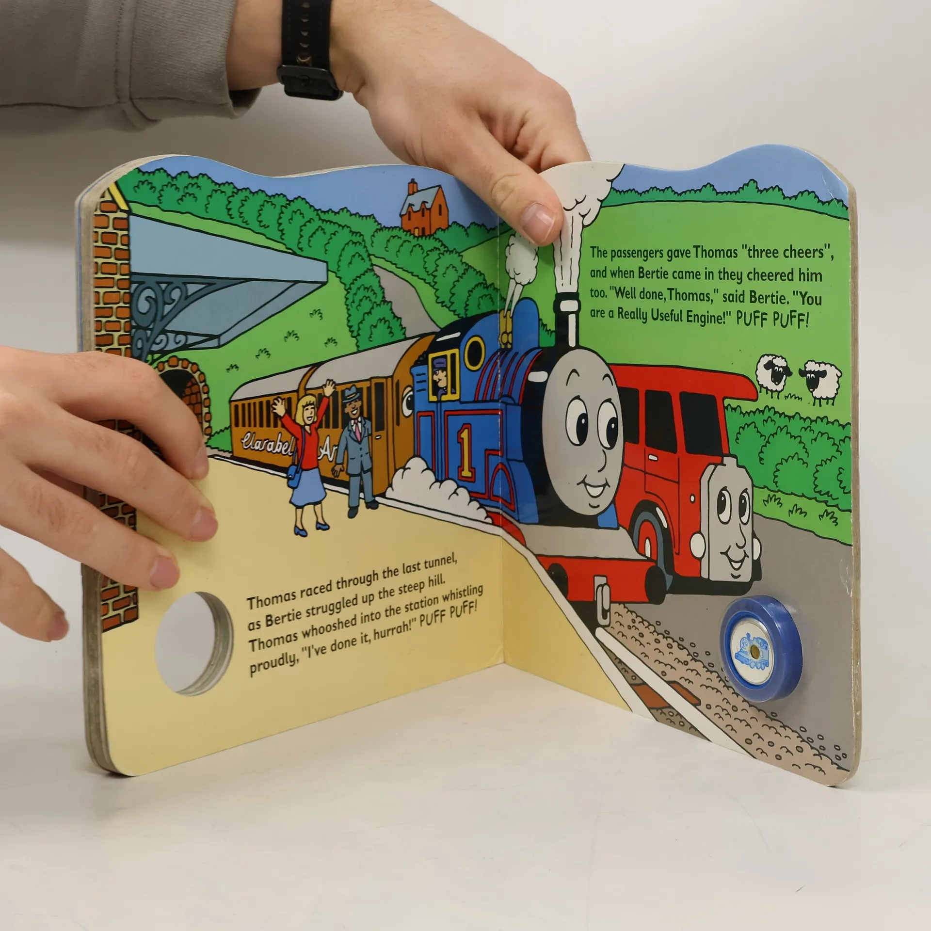 Thomas and Bertie are having a race. Press the button to hear Thomas puff puff along the rails as fast as they can, and find out who wins.