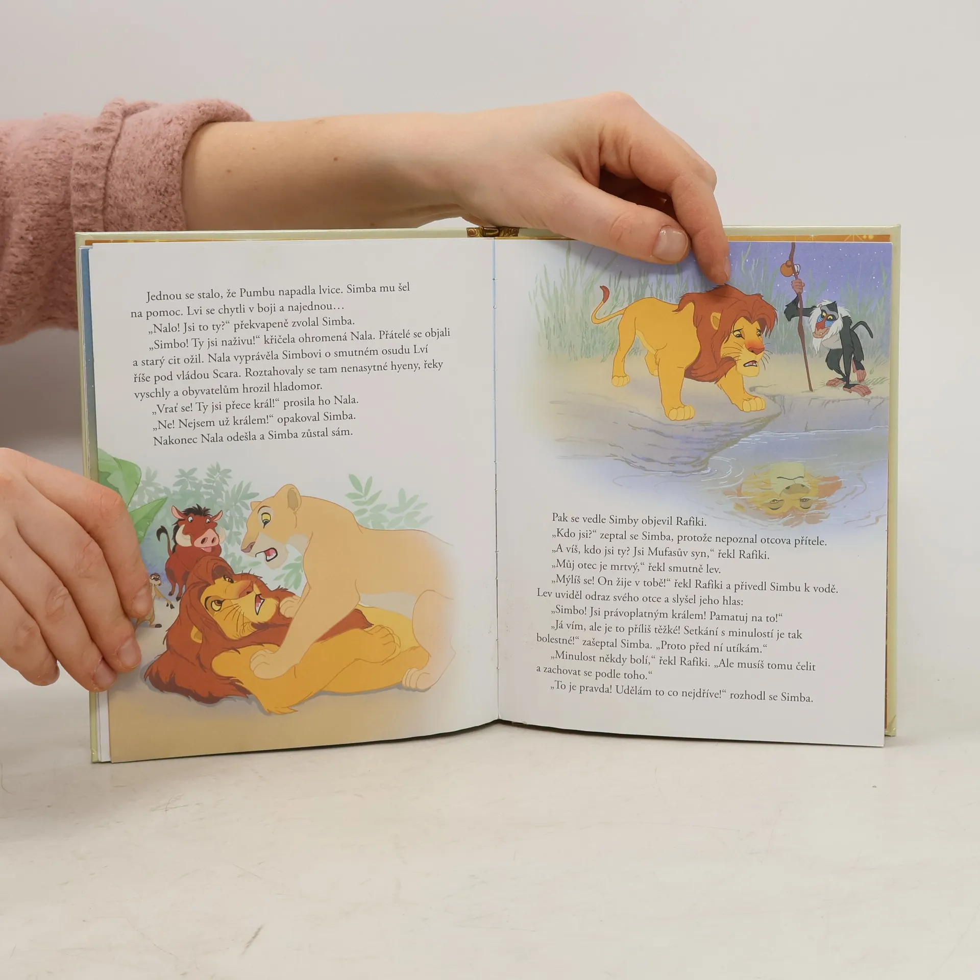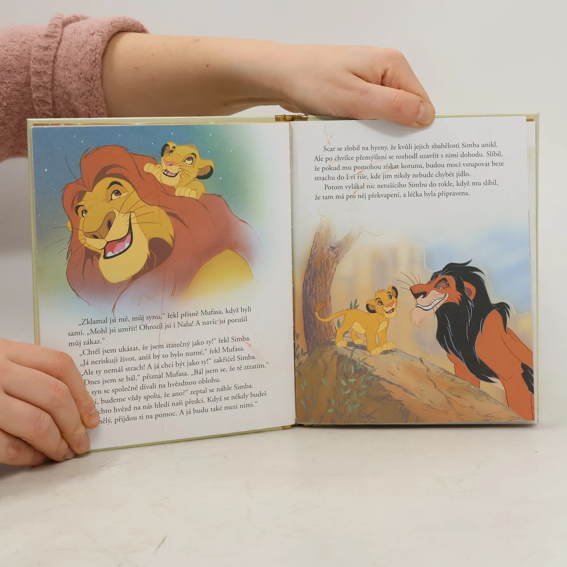 Zdivočelé stádo hnané na Scarův příkaz potměšilými hyenami by bezbranného Simbu určitě zadupalo do země, kdyby jej nezachránil jeho otec Mufasa. Při zoufalé záchraně však zahyne. Protřelému Scarovi pak nedá moc práce přesvědčit vyděšeného Simbu, že je zodpovědný za otcovu smrt a měl by neodkladně uprchnout! A tak se Scar se svojí suitou konečně dostane k moci - zatímco Simba si najde nové zvířecí přátele Pumbu a Timona, s nimiž v duchu bezstarostné filozofie Hakuna Matata vyroste do majestátní lví podoby. Ale země jeho otce strádá, královská krev se nezapře a kdesi na hvězdné obloze si Mufasa hluboce oddychl, když probuzený Simba razantně vyrazil v jeho královské stopě...