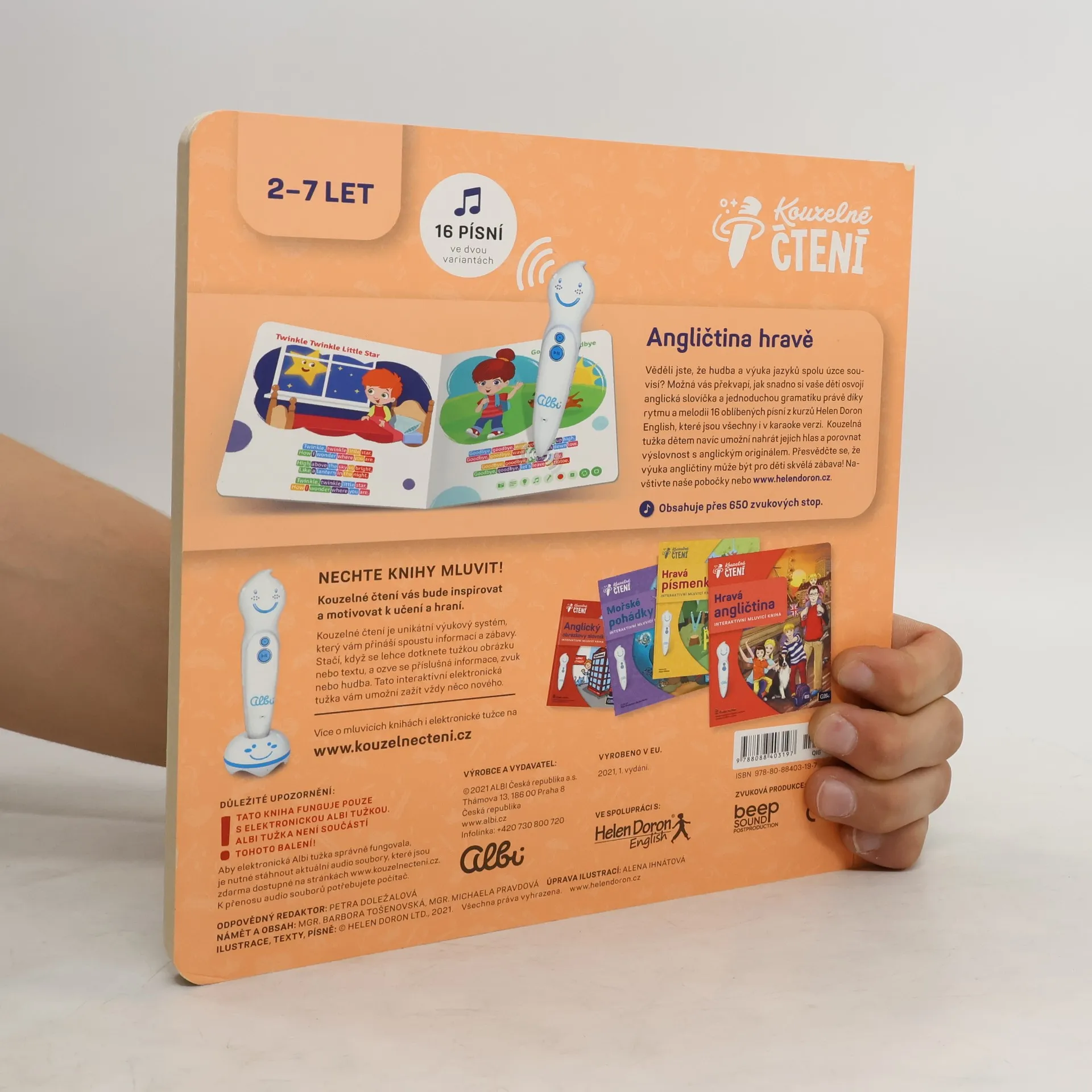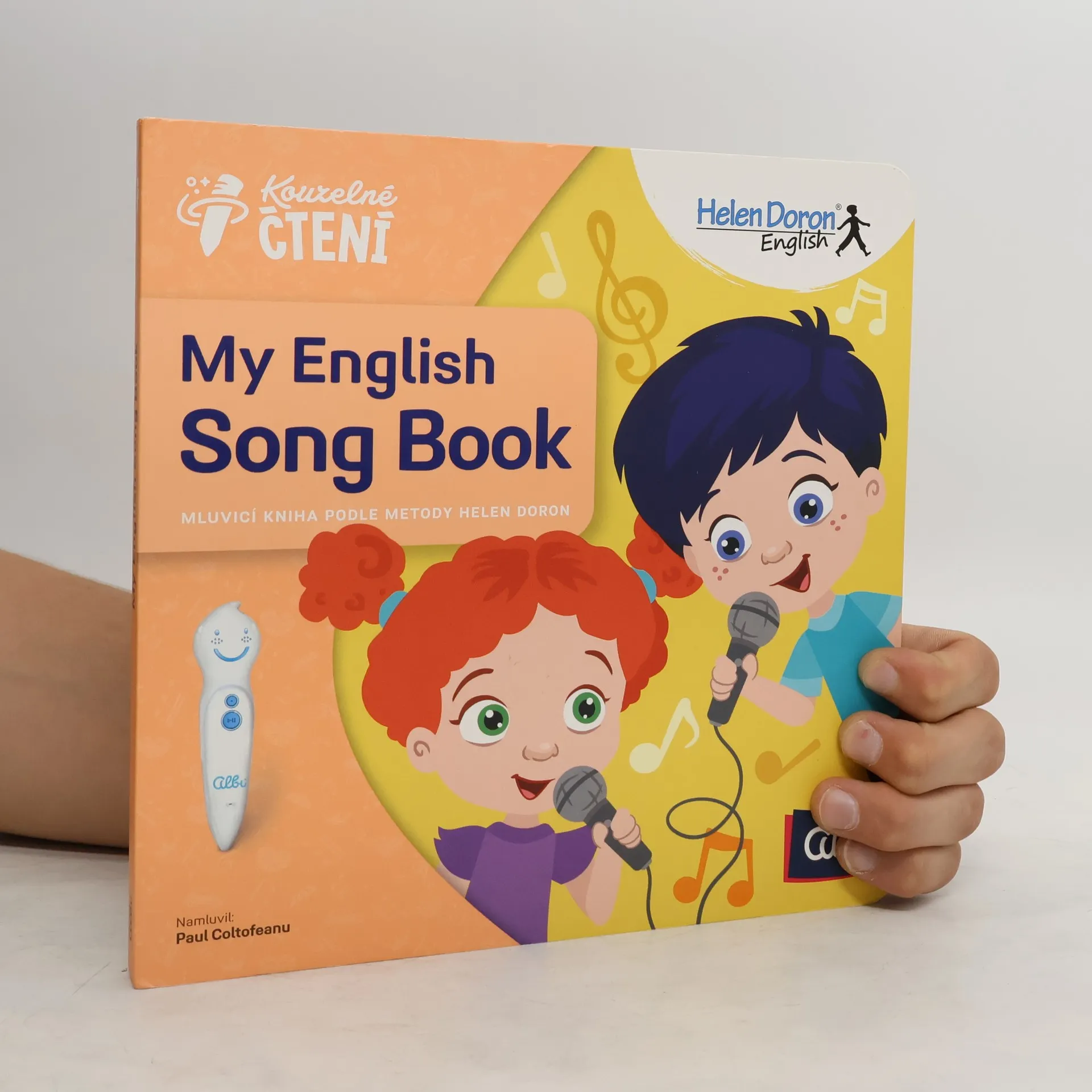 My English Song Book z edice Kouzelné čtení je další knihou vytvořenou podle metody Helen Doron. Tentokrát na vás čekají veselé anglické písničky pro nejmenší děti, které se díky rytmu snadno naučí základní anglická slovíčka. Věděli jste, že hudba a výuka jazyků spolu úzce souvisí? Možná vás překvapí, jak snadno si vaše děti osvojí anglická slovíčka a jednoduchou gramatiku právě díky rytmu a melodii 16 oblíbených písní z kurzů Helen Doron English. Zazpívat si mohou také karaoke verze písniček. Seznam písní: Big And Little; If You're Happy; Choo Choo Train; When The Bears Come Marching In; Yes, No, Why; Red, Red; Head, Shoulders, Knees And Toes; My Car; Hippety Hop; I Am Riding On My Horse; The Wheels On The Bus; Who Says Moo?; Mouth, Nose, Knees, Toes; Sing A Rainbow; Twinkle Twinkle Little Star; Goodbye, Goodbye. Kouzelná tužka dětem navíc umožní nahrát jejich hlas a porovnat výslovnost s anglickým originálem. Přesvědčte se, že výuka angličtiny může být pro děti skvělá zábava! Navštivte naše pobočky nebo web. Kniha My English Song Book obsahuje přes 650 zvukových stop. Namluvil ji Paul Coltofeanu.