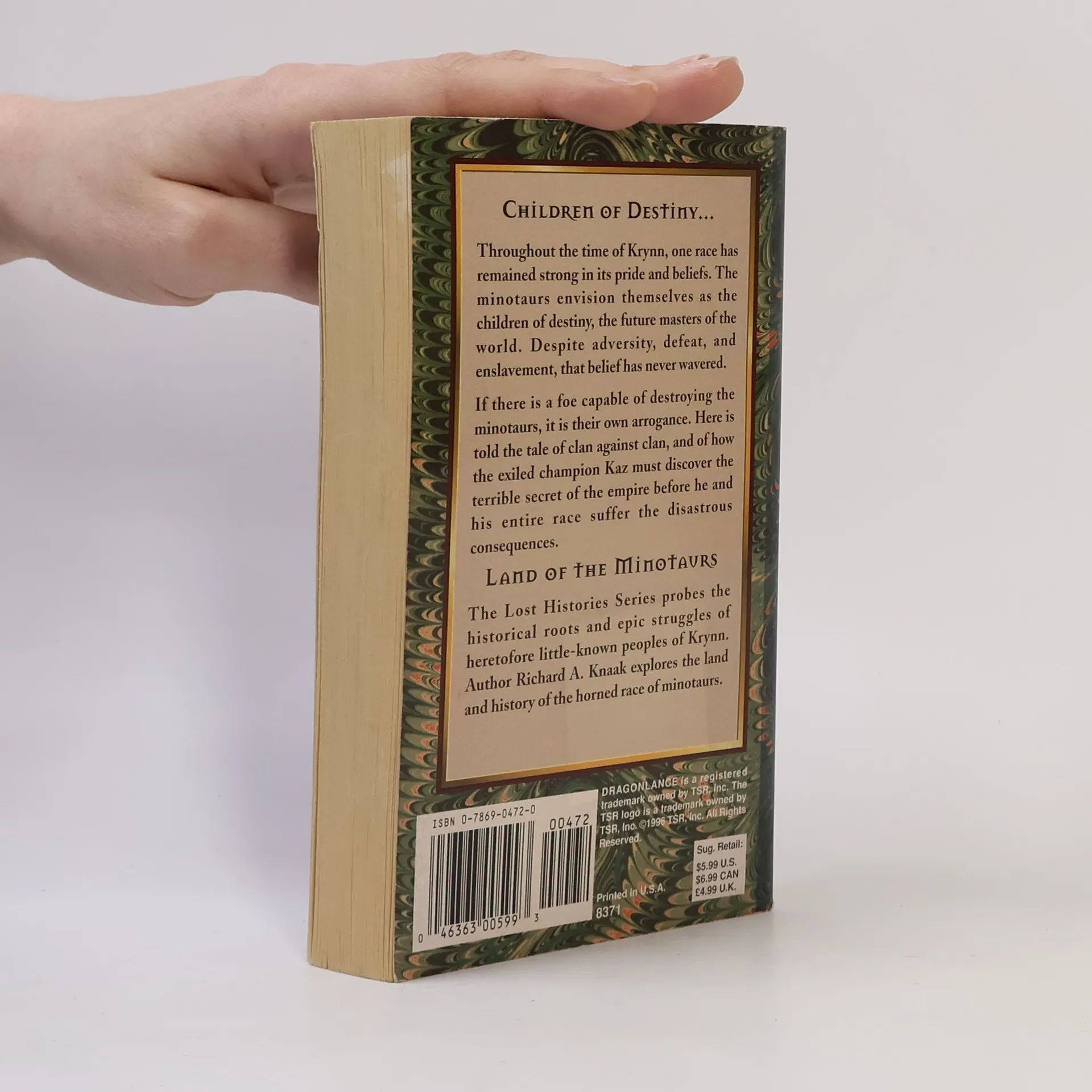 CHILDREN OF DESTINYThroughout the time of Krynn, one race has remained strong in its pride and beliefs. The minotaurs envision themselves as the children of destiny, the future masters of the world. Despite adversity, defeat, and enslavement, that belief has never wavered.If there is a foe capable of destroying the minotaurs, it is their own arrogance. Here is told the tale of clan against clan, and of how the exiled champion Kaz must discover the terrible secret of the empire before he and his entire race suffer the disastrous consequences.LAND OF THE MINOTAURSThe Lost Histories Series probes the historical roots and epic struggles of heretofore little-known peoples of Krynn. Author Richard A. Knaak explores the land and history of the honored race of minotaurs.
