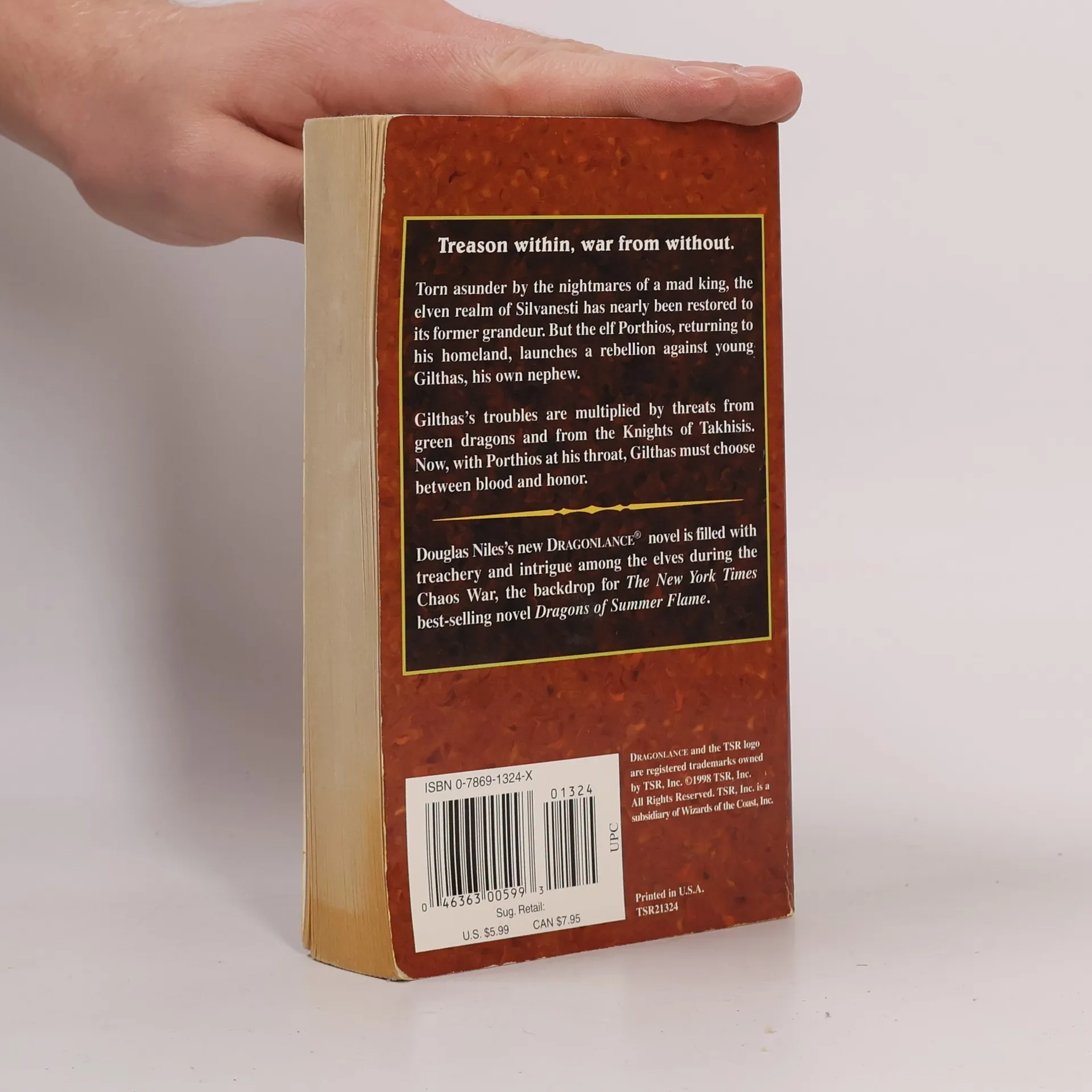 Treason within, war from without.Torn asunder by the nightmares of a mad king, the elven realm of Silvanesti has nearly been restored to its former grandeur. But the elf Porthios, returning to his homeland, launches a rebellion against young Gilthas, his own nephew.Gilthas's troubles are multiplied by threats from green dragons and from the Knights of Takhisis. Now, with Porthios at his throat, Gilthas must choose between blood and honor.Douglas Nile's new Dragonlance novel is filled with treachery and intrigue among the elves during the Chaos War, the backdrop for The New York Times best-selling novel Dragons of Summer Flame.