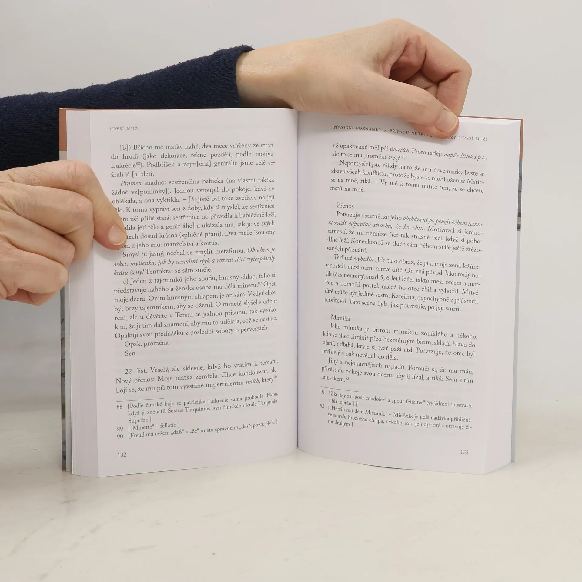 Významnou součástí Freudovy práce, s jejíž pomocí si ujasňoval své základní teorie, byly popisy jeho klinických případů – kazuistiky jeho pacientů. Ty představují fascinující možnost podívat se na to, jak probíhala Freudova každodenní sezení. V předkládaném výboru představujeme kazuistiky Krysího muže a Vlčího muže. Krysí muž shrnuje jeden z prvních popisů celé psychoanalytické léčby, klinické detaily i vnitřní svět pacienta. Ilustruje konflikt mezi touhou po lásce otce a zápasem s ním, mezi láskou a nenávistí a přemístění nenávistných pocitů do nutkavých příznaků. Naproti tomu Vlčí muž osvětluje záhadu psychosexuality, obsahující fantazie kastrace, primární scény a svedení. Freud v této kazuistice předkládá myšlenku zpětného přepracování traumatické zkušenosti, dodatečného proměňování vzpomínek a fantazií. Kazuistika Krysího muže je doplněna o rozsáhlé Freudovy poznámky, které si dělal bezprostředně po každém sezení. Ty se našly v jeho pozůstalosti a nebyly dosud česky publikovány. Jsou ale skvělým dokladem toho, jak Freud klinicky pozoroval a přemýšlel.Při četbě Freudových případových studií se ukazuje nejen to, že Freud byl schopen mistrovsky analyzovat lidské nitro a promluvit o vytěsněných stránkách lidské duše, ale i to, že jeho výpovědi mají vysokou literární úroveň.