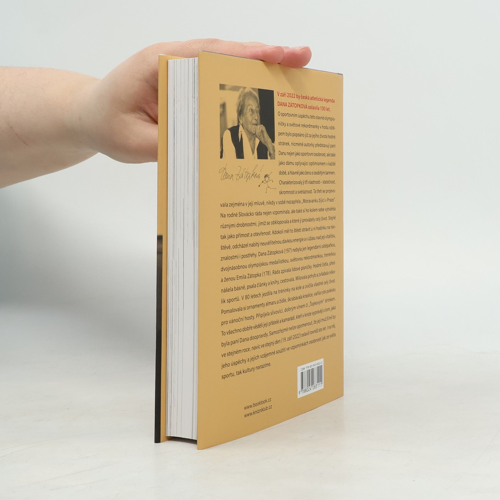 Vzpomínky přátel na pozoruhodný život naší legendární atletky, která by v září 2022 oslavila 100 let. O sportovním úspěchu této olympioničky a světové rekordmanky v hodu oštěpem bylo popsáno již hodně stránek, nicméně autorky představují paní Danu nejen jako sportovní osobnost, ale také jako dámu oplývající optimismem a osobitým šarmem. Charakterizovaly ji tři vlastnosti – statečnost, skromnost a svéráznost. Dana Zátopková (†97) nebyla jen dvojnásobnou olympijskou medailistkou, světovou rekordmankou, trenérkou a ženou Emila Zátopka (†78). Ráda zpívala lidové písničky a nikdy v sobě nezapřela Moravanku žijící v Praze. Byla nabitá energií až do pozdního věku. To všechno dobře věděli její přátelé, kteří v knize vyprávějí o tom, jaká byla paní Dana doopravdy. Samozřejmě nelze opomenout, že její muž Emil by ve stejném roce, navíc ve stejný den (19. září 2022) oslavil rovněž sto let. Také na něj a jejich vzájemné soužití ve vzpomínkách osobností ze světa sportu i kultury narazíme.
