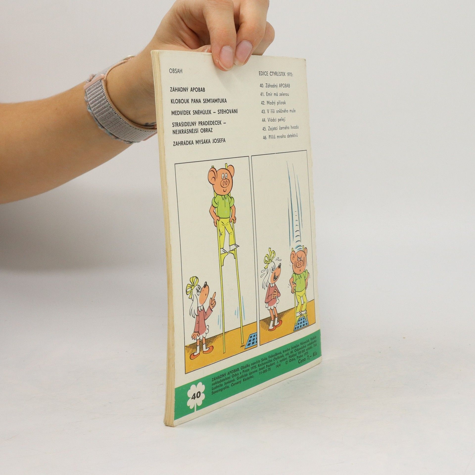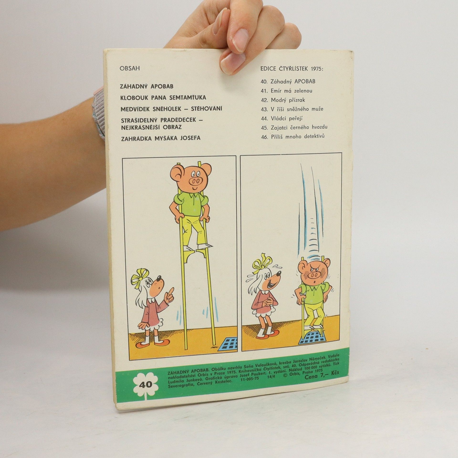40. díl série Záhadný Apobab - Ljuba Štíplová, Jaroslav Němeček. Klobouk pana Semtamťuka - Svatopluk Hrnčíř, Adolf Born. Medvídek Sněhůlek - Stěhování - Marie Kšajtová, Zdeňka Krejčová. Strašidelný pradědeček - Nejkrásnější obraz - Vojtěch Steklač, Věra Faltová. Zahrádka myšáka Josefa - Ondřej Suchý.