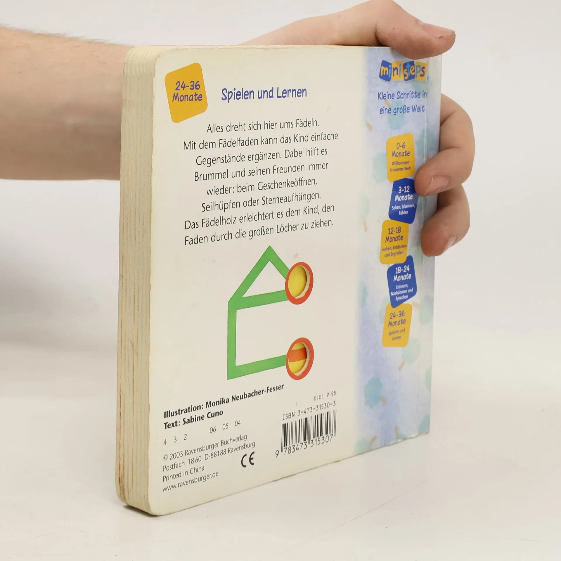 Dieses Bilderbuch fördert spielerisch das Fädeln und unterstützt Kinder dabei, die Kordel durch große Löcher zu ziehen. Es schult sowohl die Motorik als auch die Sprache.