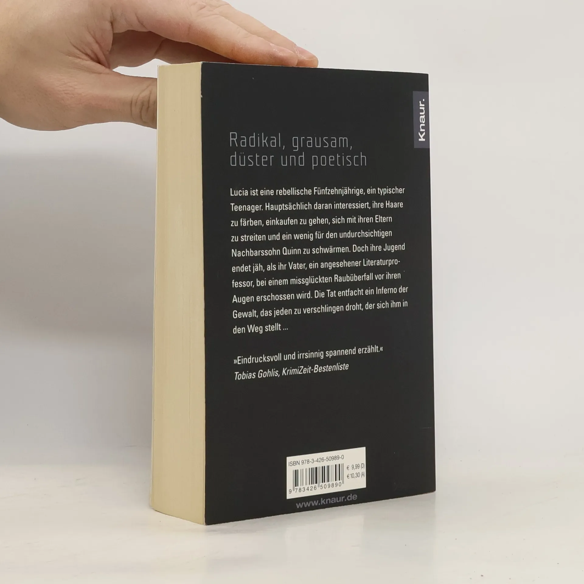 Die fünfzehnjährige Lucia führt ein typisches Teenagerleben, bis ihr Vater bei einem Raubüberfall erschossen wird. Diese Tragödie löst eine Welle der Gewalt aus, die alles und jeden bedroht. Der Roman wird als eindrucksvoll und spannend beschrieben.