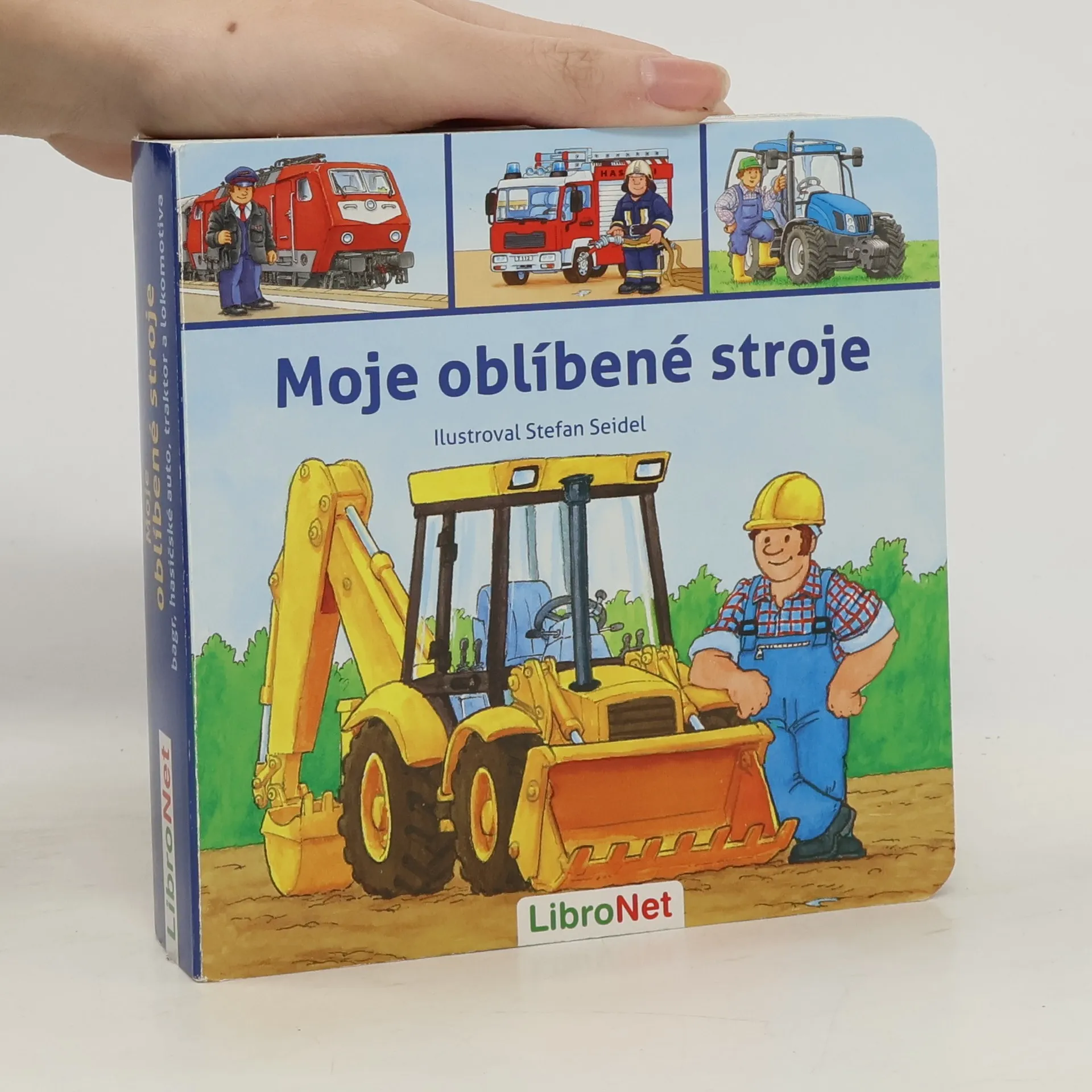 Bagr, hasičské auto, traktor a lokomotiva. Takové krásné stroje najdeš v této knížce.Podívej se, co dokážou!