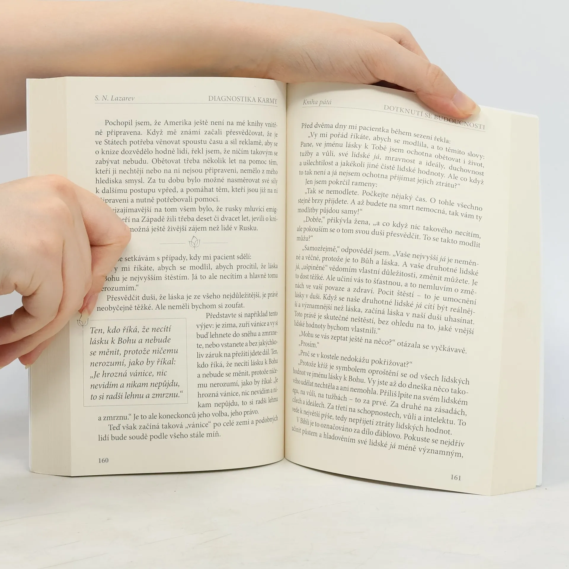 - Diagnostika karmy 5 Návod na přežití. Jak překonávat lpění na mravnosti, spravedlnosti, ideálech a duchovnosti. Člověk stoupá k Bohu jakoby po schodišti. Není přitom závislý na schodu, který právě nechal za sebou, ale na tom, který má zrovna před sebou. A aby se zvedl na další, musí nějaký čas žít pro něj, cítit ho, učinit ho svým cílem – to je nevyhnutelné. Jenže jakmile tohle zvládne, zvykne si a na dalším schodu se postupně dostavuje pocit jistoty; musí z něj spadnout dolů. V takovém případě ztrácí kontakt se schodem, který měl před sebou, a už není spojen s tím, který je za ním. A právě v tomto okamžiku rozpadajícího se bytí záleží na tom, nakolik se člověk vynasnaží zachovat v sobě lásku ke Stvořiteli. Čím větší štěstí, čím větší vzplanutí lásky zakouší, když se dotýká nových lidských hodnot, tím větší bolest musí po čase přestát, aby jeho duše k těmto hodnotám příliš nepřirostla! Proto ty útrapy, proto ta muka. Nakolik je člověk připraven k ochraně a zachování pocitu lásky, natolik se katastrofa stává soutěží, v které se člověk rozvíjí, a neštěstí se pro něj stává cvičnou překážkovou dráhou.