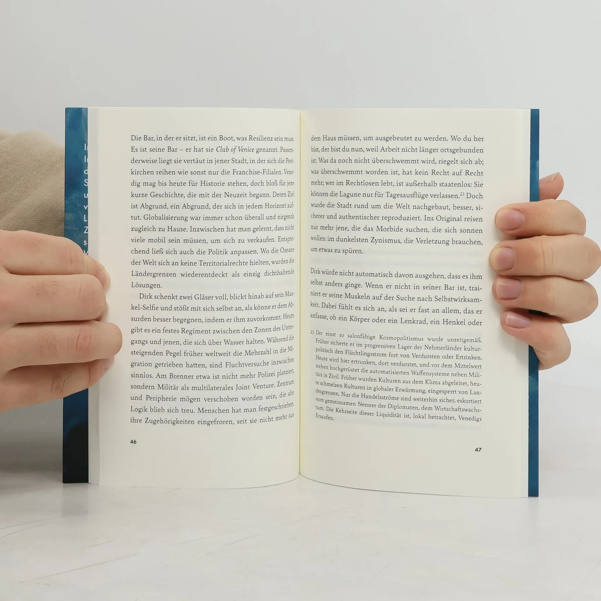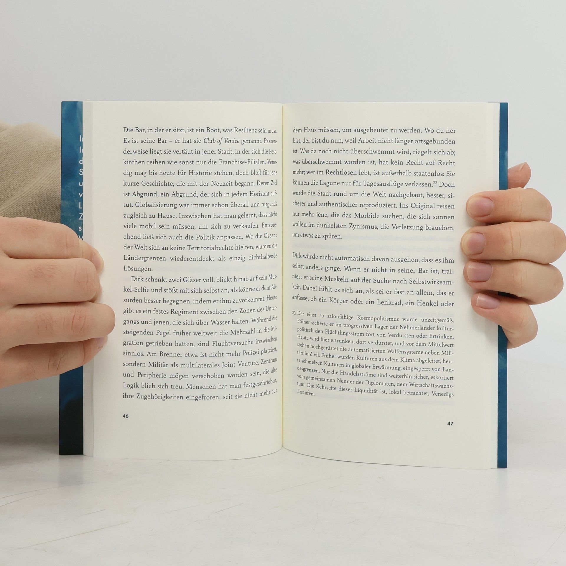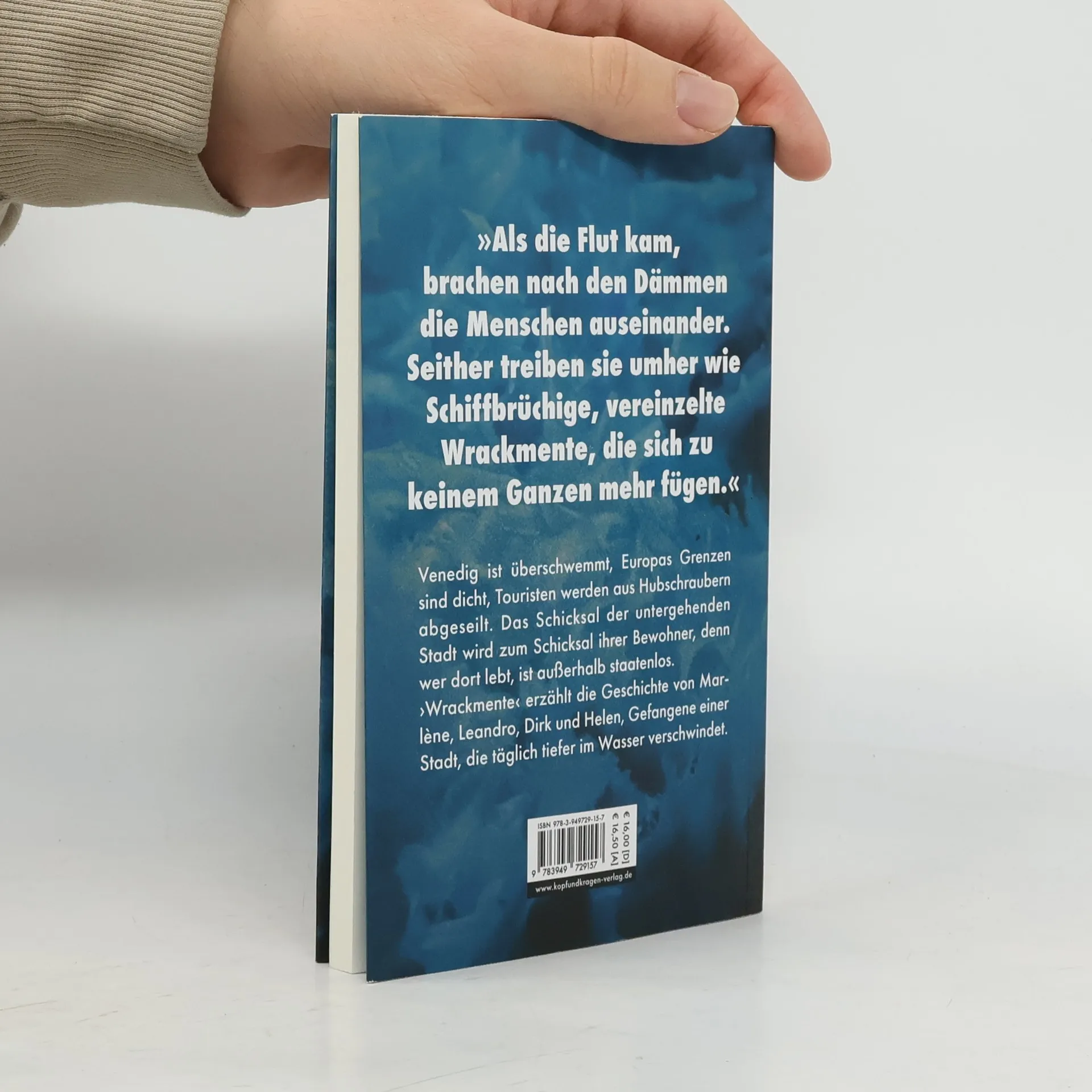 In "Wrackmente" wird das Schicksal der Venedig-Bewohner in einer überfluteten Stadt erzählt, wo sie als staatenlos gelten. Marlène, Leandro, Dirk und Helen kämpfen in einer Welt ohne Zukunft gegen den Untergang, während die schlimmsten Ängste Realität werden. Das Buch thematisiert den Verlust von Gemeinschaft und die Notwendigkeit neuer Erzählformen.