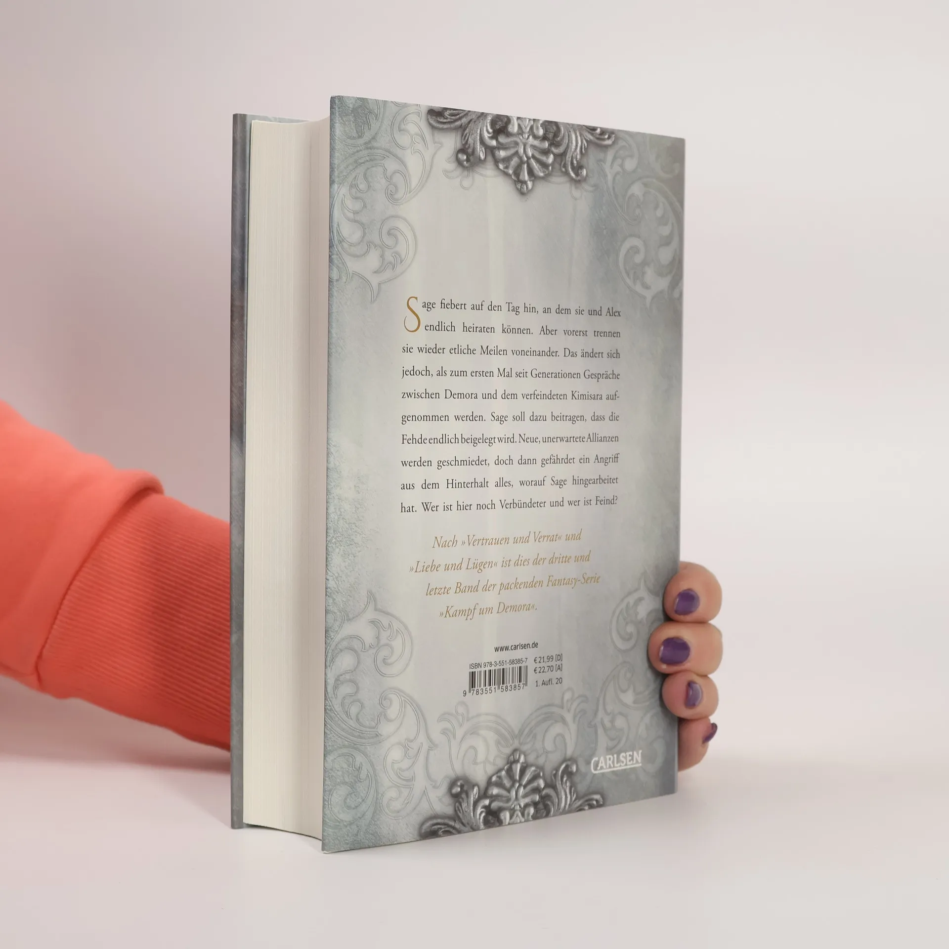 Sage wartet sehnsüchtig auf ihre Hochzeit mit Alex, doch die Entfernung zwischen ihnen bleibt. Als Gespräche zwischen den verfeindeten Ländern Demora und Kimisara beginnen, soll Sage helfen, die Fehde zu beenden. Unerwartete Allianzen entstehen, aber ein Hinterhalt bedroht alles, was sie erreicht hat. Dies ist der letzte Band der Serie „Kampf um Demora“.