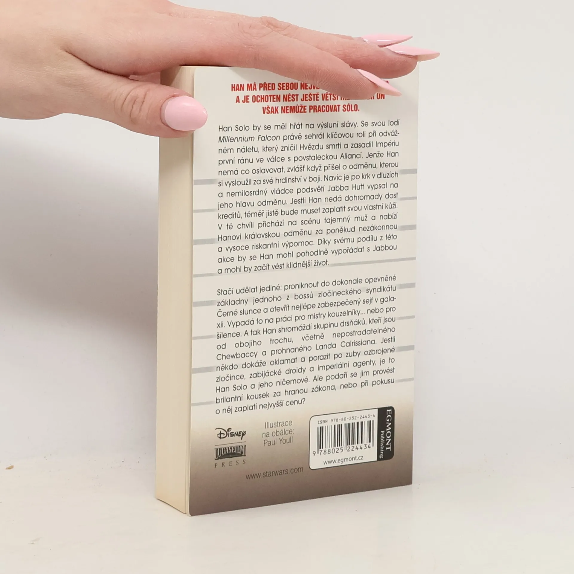 Han má před sebou největší akci svého života a je ochoten nést ještě větší riziko. Ani on však nemůže pracovat sólo. Han Solo by se měl hřát na výsluní slávy. Se svou lodí Millenium Falcon právě sehrál klíčovou roli při odvážném náletu, který zničil Hvězdu smrti a zasadil Impériu první ránu ve válce s povstaleckou Aliancí. Jenže Han nemá co oslavovat, zvlášť když přišel o odměnu, kterou si vysloužil za své hrdinství v boji. Navíc je po krk v dluzích a nemilosrdný vládce podsvětí Jabba Hutt vypsal na jeho hlavu odměnu. Jestli Han nedá dohromady dost kreditů, téměř jistě bude muset zaplatit svou vlastní kůží. V té chvíli přichází na scénu tajemný muž a nabízí Hanovi královskou odměnu za poněkud nezákonou a vysoce riskantní výpomoc. Díky svému podílu z této akce by se Han mohl pohodlně vypořádat s Jabbou a mohl by začít vést klidnější život. Stačí udělat jediné: proniknout do ultra opevněné základny jednoho z bossů zločineckého syndikátu Černé slunce a otevřít nejlépe zabezpečený sejf v galaxii. Vypadá to na práci pro mistry kouzelníky… nebo pro šílence. A tak Han shromáždí skupinu drsňáků, kteří jsou od obojího trochu, včetně nepostradatelného Chewbaccy a prohnaného Landa Calrissiana. Jestli někdo dokáže oklamat a porazit po zuby ozbrojené zločince, zabijácké droidy a imperiální agenty, je to Han Solo a jeho ničemové. Ale podaří se jim provést brilantní kousek za hranou zákona, nebo při pokusu o něj zaplatí nejvyšší cenu?