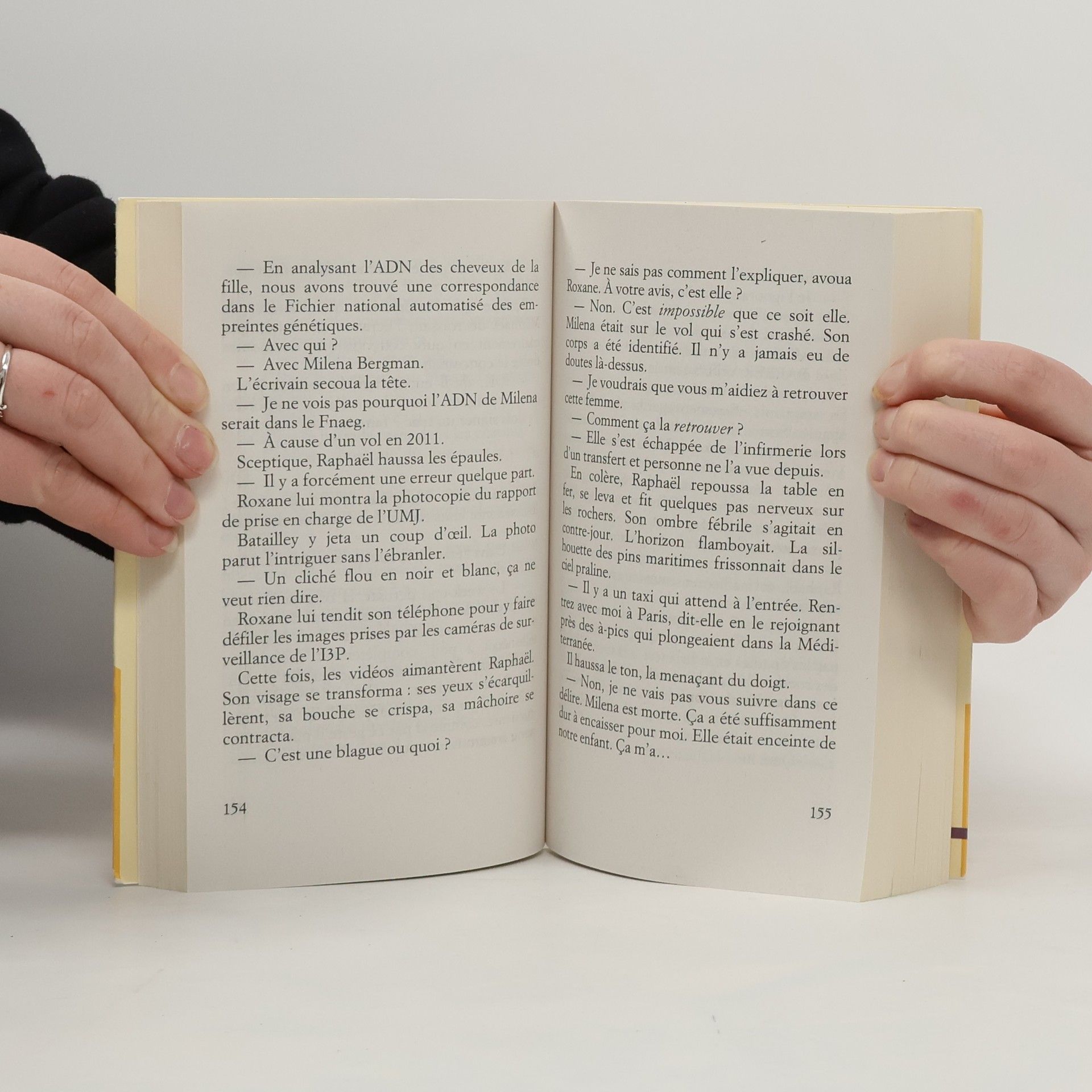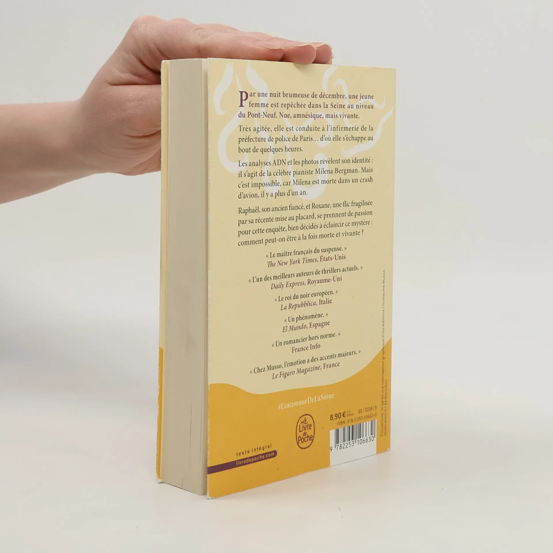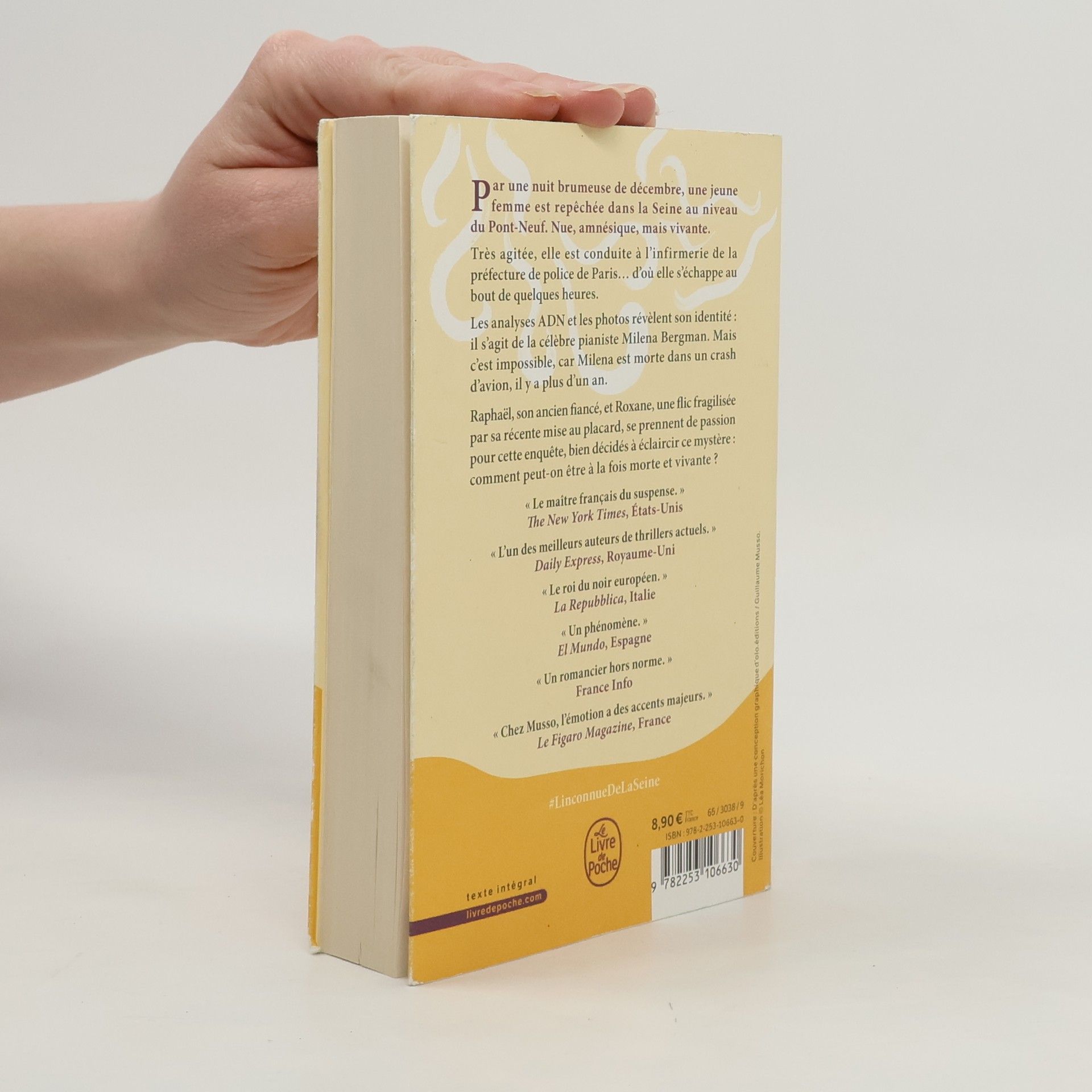 "Par une nuit brumeuse de décembre, une jeune femme est repêchée dans la Seine au niveau du Pont-Neuf. Nue, amnésique, mais vivante. Très agitée, elle est conduite à l'infirmerie de la préfecture de police de Paris... d'où elle s'échappe au bout de quelques heures. Les analyses ADN et les photos révèlent son identité : il s'agit de la célèbre pianiste Milena Bergman. Mais c'est impossible, car Milena est morte dans un crash d'avion, il y a plus d'un an. Raphaël, son ancien fiancé, et Roxane, une flic fragilisée par sa récente mise au placard, se prennent de passion pour cette enquête, bien décidés à éclaircir ce mystère : comment peut-on être à la fois morte et vivante?" - Back cover