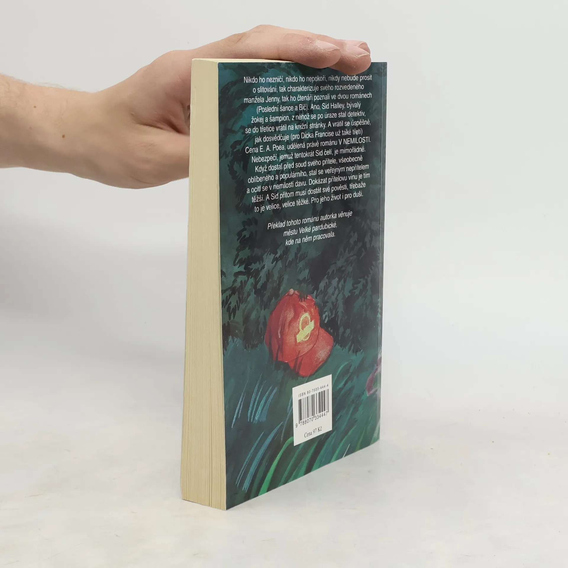 Nikdo ho nezničí, nikdo ho nepokoří, nikdy nebude prosit o slitování, tak charakterizuje svého rozvedeného manžela Jenny, tak ho čtenáři poznali ve dvou románech (Poslední šance a Bič). Ano, Sid Halley, bývalý žokej a šampion, z něhož se po úraze stal detektiv, se do třetice vrátil na knižní stránky. A vrátil se úspěšně, jak dosvědčuje (pro Dicka Francise už také třetí) Cena E. A. Poea, udělená právě románu V nemilosti. Nebezpečí, jemuž tentokrát Sid čelí, je mimořádné. Když dostal před soud svého přítele, všeobecně oblíbeného a populárního, stal se veřejným nepřítelem a ocitl se v nemilosti davu. Dokázat přítelovu vinu je tím těžší. A Sid přitom musí dostát své pověsti, třebaže to je velice těžké. Pro jeho další život i pro duši.