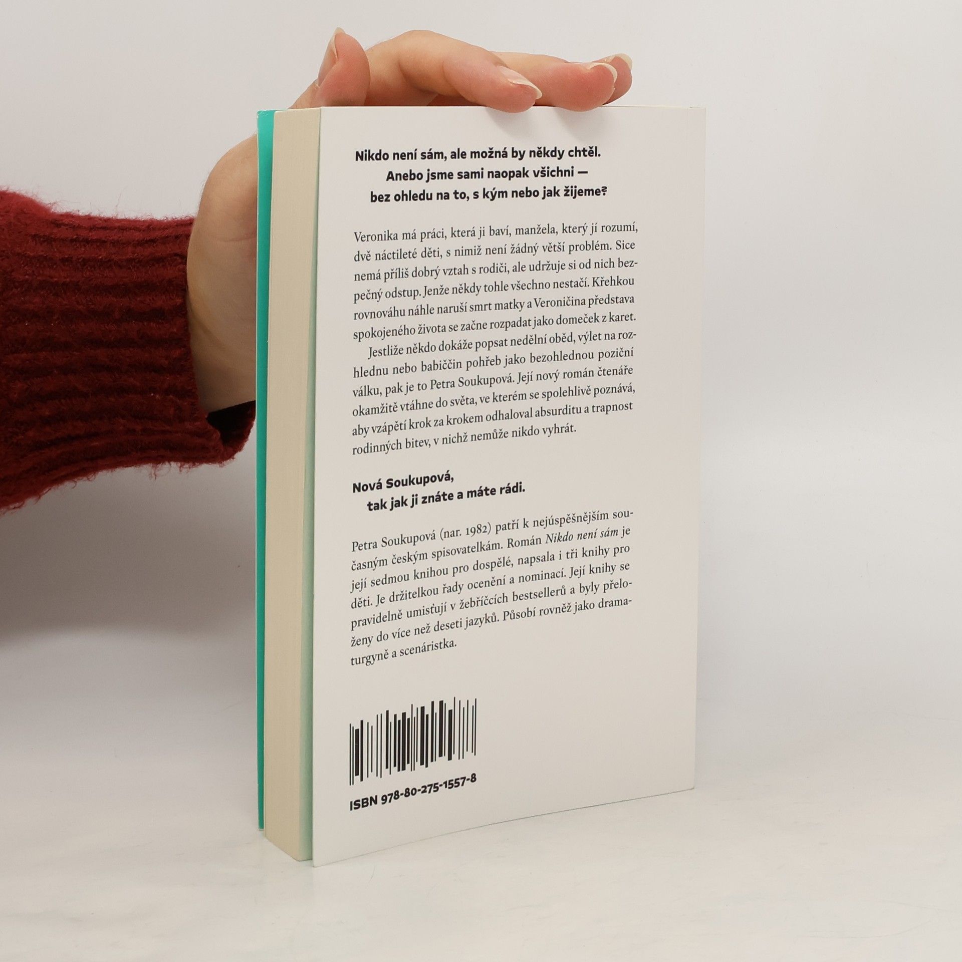 Nikdo není sám, ale možná by někdy chtěl. Anebo jsme sami naopak všichni bez ohledu na to, s kým nebo jak žijeme? Veronika má práci, která ji baví, manžela, který jí rozumí, dvě náctileté děti, s nimiž není žádný větší problém. Sice nemá příliš dobrý vztah s rodiči, ale udržuje si od nich bezpečný odstup. Jenže někdy tohle všechno nestačí. Křehkou rovnováhu náhle naruší smrt matky a Veroničina představa spokojeného života se začne rozpadat jako domeček z karet. Jestliže někdo dokáže popsat nedělní oběd, výlet na rozhlednu nebo babiččin pohřeb jako bezohlednou poziční válku, pak je to Petra Soukupová. Její nový román čtenáře okamžitě vtáhne do světa, ve kterém se spolehlivě poznává, aby vzápětí krok za krokem odhaloval absurditu a trapnost rodinných bitev, v nichž nemůže nikdo vyhrát.