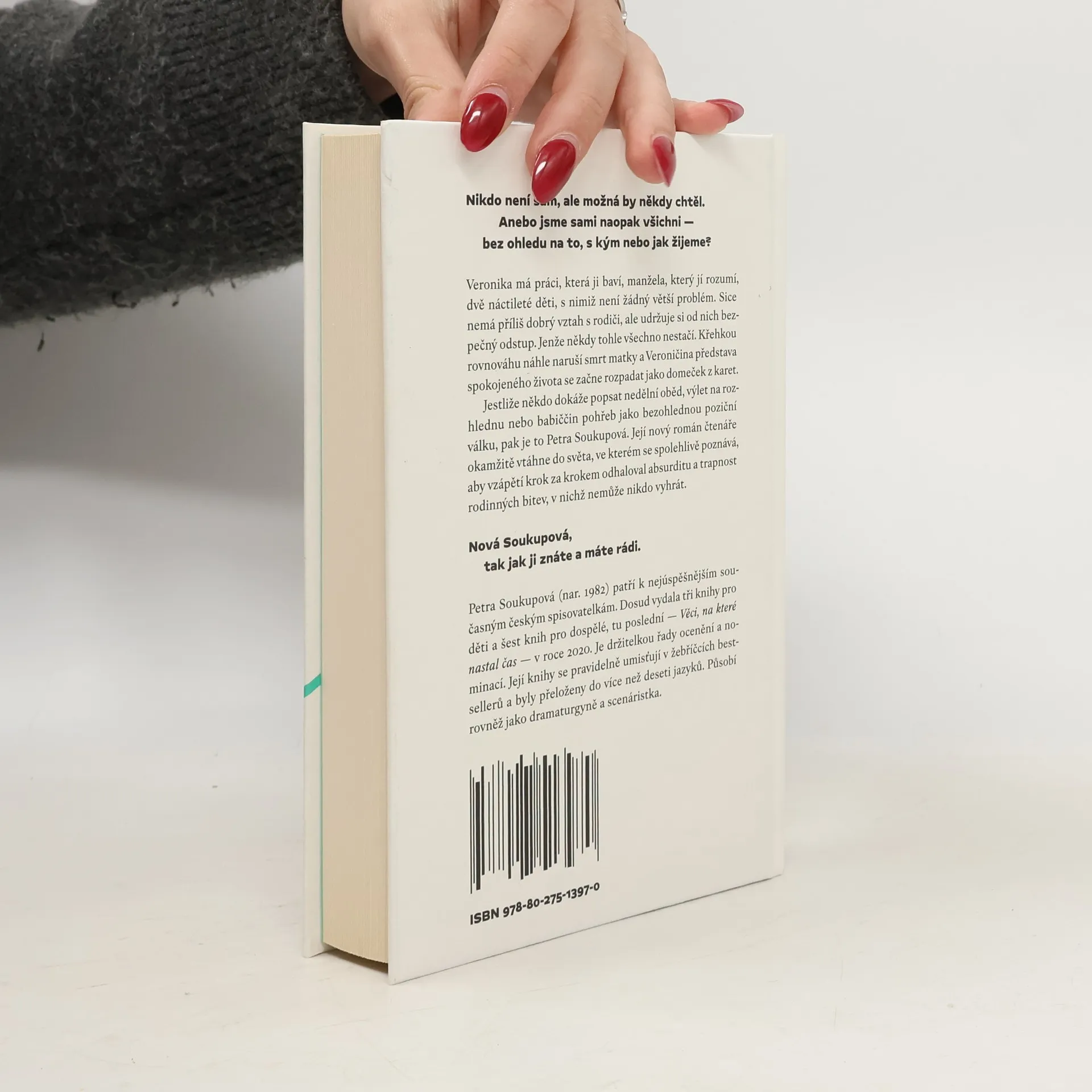 Nikdo není sám, ale možná by někdy chtěl. Anebo jsme sami naopak všichni — bez ohledu na to, s kým nebo jak žijeme?Veronika má práci, která ji baví, manžela, který jí rozumí, dvě náctileté děti, s nimiž není žádný větší problém. Sice nemá příliš dobrý vztah s rodiči, ale udržuje si od nich bezpečný odstup. Jenže někdy tohle všechno nestačí. Křehkou rovnováhu náhle naruší smrt matky a Veroničina představa spokojeného života se začne rozpadat jako domeček z karet.Jestliže někdo dokáže popsat nedělní oběd, výlet na rozhlednu nebo babiččin pohřeb jako bezohlednou poziční válku, pak je to Petra Soukupová. Její nový román čtenáře okamžitě vtáhne do světa, ve kterém se spolehlivě poznává, aby vzápětí krok za krokem odhaloval absurditu a trapnost rodinných bitev, v nichž nemůže nikdo vyhrát.Nová Soukupová, tak jak ji znáte a máte rádi.