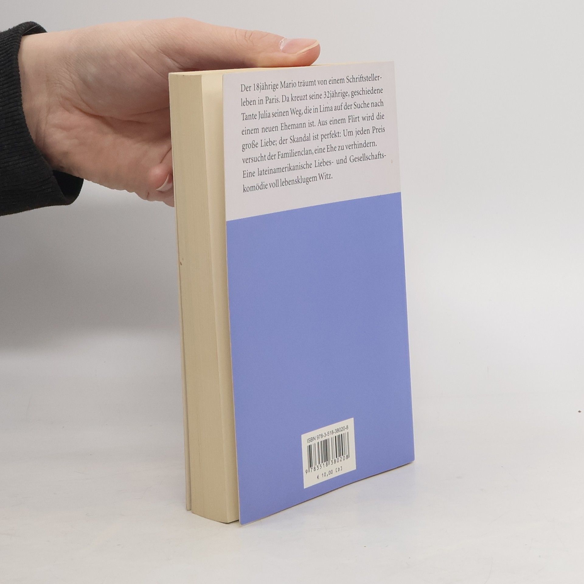 Tante Julia, ebenso attraktiv wie kapriziös, taucht nach ihrer Scheidung in Lima auf, wo sie einen neuen Ehemann zu finden hofft. Doch es kommt anders. Ihr Neffe Mario verliebt sich in sie, ein gerade 18-jähriger Student, der beim Radio jobbt und von einem Schriftstellerleben in Paris träumt. Aus dem unwahrscheinlichen Flirt wird die große Liebe, der Skandal ist perfekt: Um jeden Preis versucht der Familienclan, ihr Glück zu verhindern. Mario und Tante Julia fliehen, und auf einer irrwitzigen Fahrt durch das Land suchen sie einen bestechlichen Bürgermeister, der den Minderjährigen mit seiner Tante traut. Einer der berühmtesten Romane der lateinamerikanischen Literatur und der beliebteste Roman des Nobelpreisträgers Mario Vargas Llosa: eine rasante Liebes- und Gesellschaftskomödie voll lebensklugem Witz.