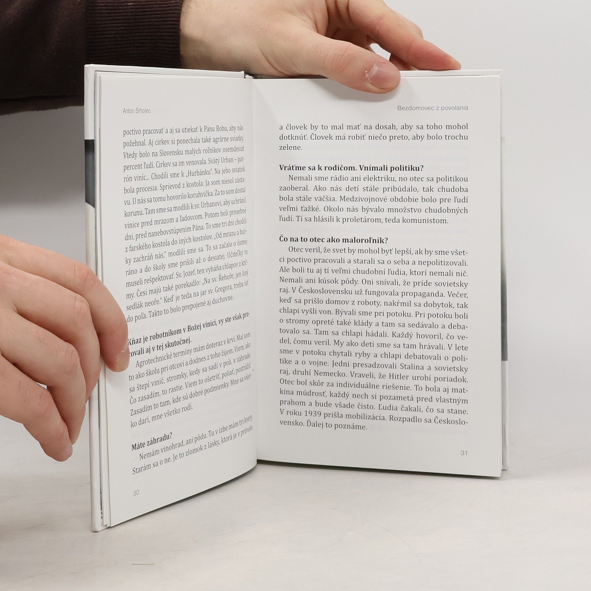Kniha rozhovorov a fotografií. Kniha rozhovorov Anton Srholec - Bezdomovec z povolania je kniha o láske, odpúšťaní, viere, nezlomnosti, slobode a radosti. Vznikala vyše dvoch rokov. Autorom rozhovorov s charizmatickým kňazom, ktorý sa stará o bezdomovcov je spisovateľ, hudobník a publicista Pišta Vandal Chrappa. Autorom fotografií je fenomenálny Matúš Zajac. Kniha má dvadsaťjeden kapitol. Pišta Vandal sa s Antonom Srholcom rozprával o pokušeniach, ktoré dáva moc, o duchovnom povolaní a úskaliach kňazstva, o živote v lágri, o besoch komunizmu, o strachu, o nádeji i beznádeji, o pravde, slobode, o živote i smrti. Fotografie Matúša Zajaca zachytávajú intimitu každodennosti Antona Srholca. Zameriavajú sa hlavne na jeho kňazstvo a prácu s bezdomovcami.