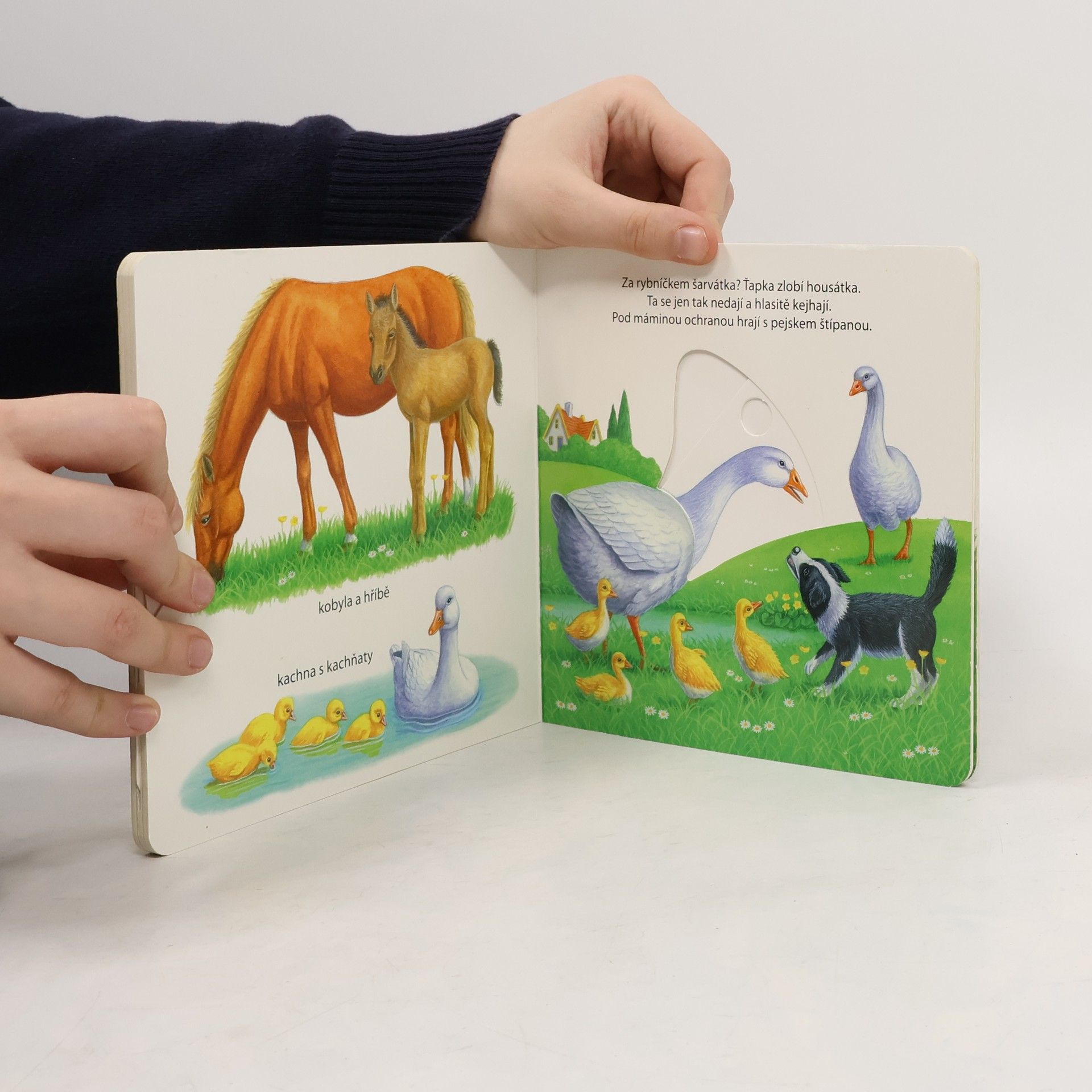 Veršované knížkové leporelo s veselými ilustracemi zvířátek. Děti mohou jednoduchými posuvnými mechanismy zvířátka rozpohybovat.
