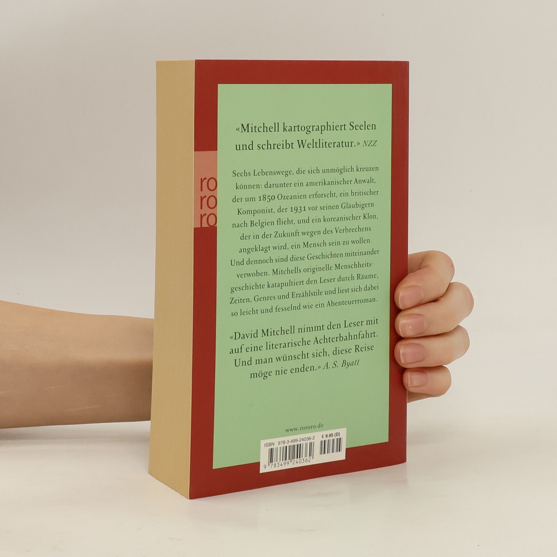 Sechs Lebenswege, die sich unmöglich kreuzen können: darunter ein amerikanischer Anwalt, der um 1850 Ozeanien erforscht, ein britischer Komponist, der 1931 vor seinen Gläubigern nach Belgien flieht, und ein koreanischer Klon, der in der Zukunft wegen des Verbrechens angeklagt wird, ein Mensch sein zu wollen. Und dennoch sind diese Geschichten miteinander verwoben. Mitchells originelle Menschheitsgeschichte katapultiert den Leser durch Räume, Zeiten, Genres und Erzählstile und liest sich dabei so leicht und fesselnd wie ein Abenteuerroman.„David Mitchell nimmt den Leser mit auf eine literarische Achterbahnfahrt. Und man wünscht sich, diese Reise möge nie enden.“