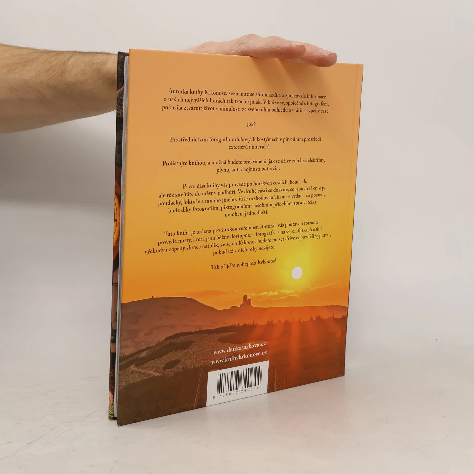 Autorka knihy Krkonoše, seznamte se! shromáždila a zpracovala informace o našich nejvyšších horách tak trochu jinak. V knize se, společně s fotografem, pokusila ztvárnit život v minulosti ze svého úhlu pohledu a vrátit se zpět v čase.Jak?Prostřednictvím fotografií v dobových kostýmech v původním prostředí exteriérů i interiérů.Prolistujte knihou, a možná budete překvapeni, jak se dříve žilo bez elektřiny, plynu, aut a hojnosti potravin.První část knihy vás provede po horských cestách, boudách, ale též zavítáte do měst v podhůří. Ve druhé části se dozvíte, co jsou dračky, srp, poudačky, loktuše a mnoho jiného. Vaše rozhodování, kam se vydat a co poznat, bude díky fotografiím, piktogramům a osobním příběhům autorky mnohem jednodušší.Tato kniha je určena pro širokou veřejnost. Autorka vás poutavou formou provede do míst, která jsou běžně dostupná, a fotograf vás na svých fotkách oslní východy i západy slunce natolik, že se do Krkonoš budete muset dříve či později vypravit, pokud už v nich roky nežijete.Tak přijďte pobejt do Krkonoš!