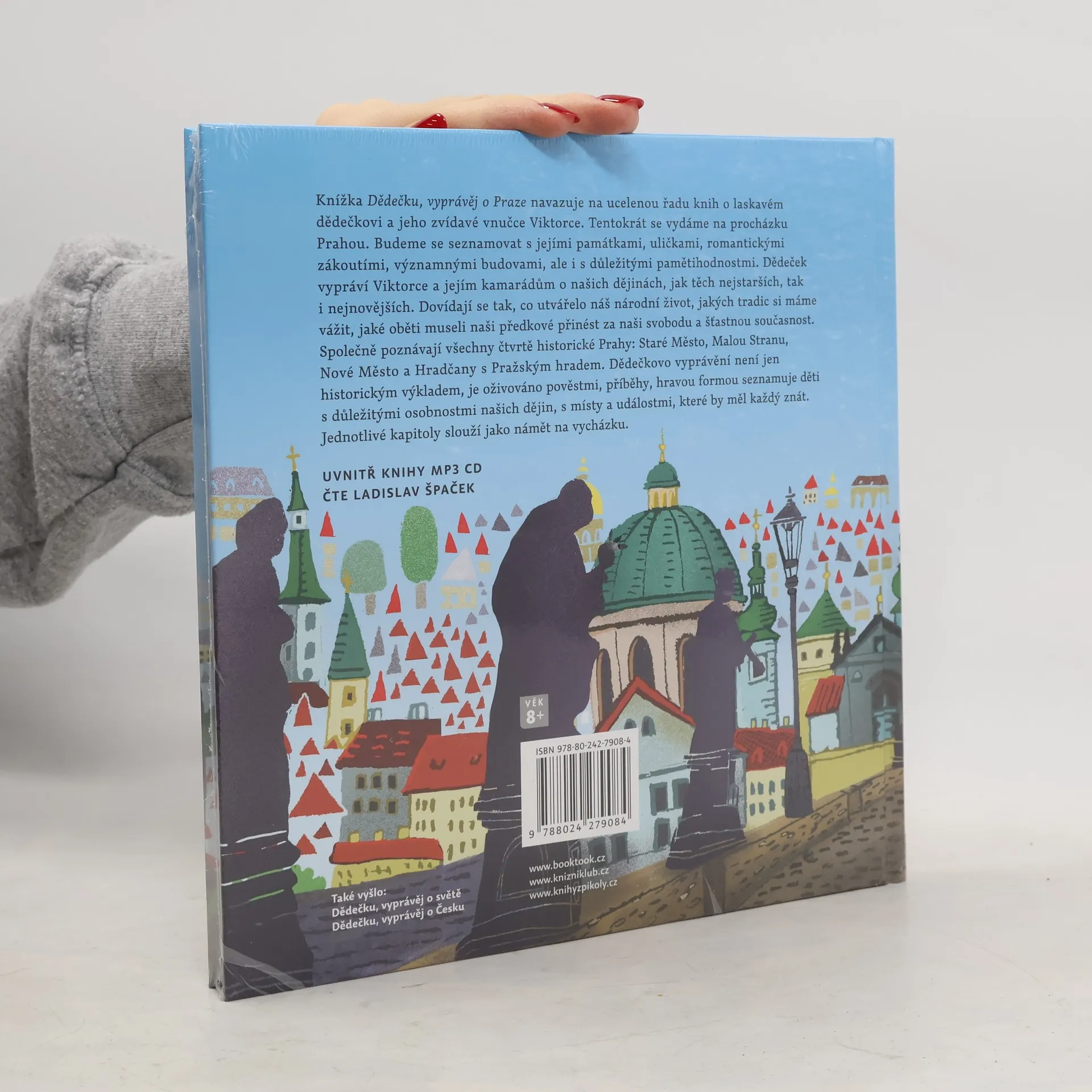 Knížka Dědečku, vyprávěj o Praze navazuje na ucelenou řadu knih o laskavém dědečkovi a jeho zvídavé vnučce Viktorce. Tentokrát se vydáme na procházku Prahou. Budeme se seznamovat s jejími památkami, uličkami, romantickými zákoutími, významnými budovami, ale i s důležitými pamětihodnostmi. Dědeček vypráví Viktorce a jejím kamarádům o našich dějinách, jak těch nejstarších, tak i nejnovějších. Dovídají se tak, co utvářelo náš národní život, jakých tradic si máme vážit, jaké oběti museli naši předkové přinést za naši svobodu a šťastnou současnost. Společně poznávají všechny čtvrtě historické Prahy: Staré Město, Malou Stranu, Nové Město a Hradčany s Pražským hradem. Dědečkovo vyprávění není jen historickým výkladem, je oživováno pověstmi, příběhy, hravou formou seznamuje děti s důležitými osobnostmi našich dějin, s místy a událostmi, které by měl každý znát. Jednotlivé kapitoly slouží jako námět na vycházku. Součástí je audiokniha, již namluvil sám Ladislav Špaček.