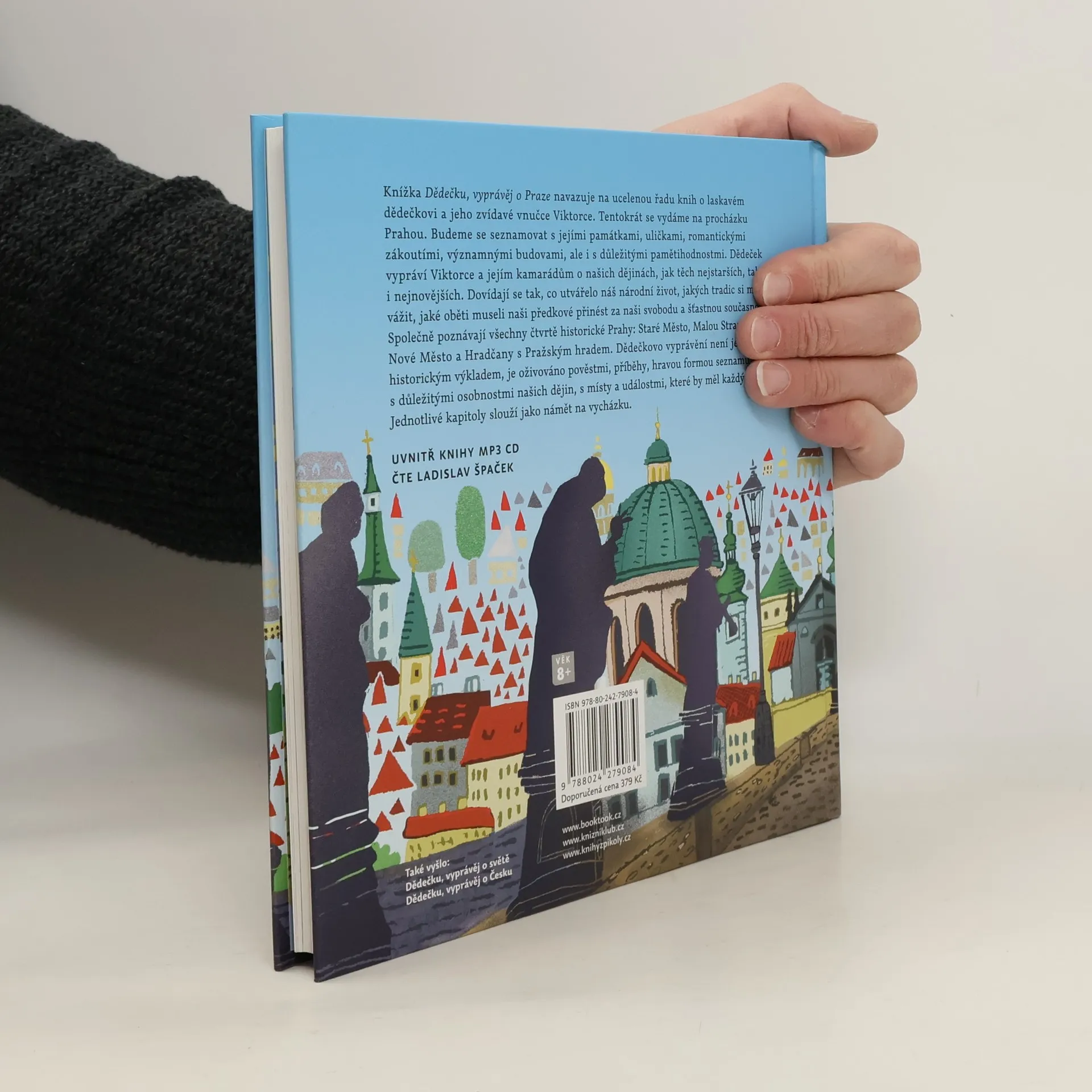 Knížka Dědečku, vyprávěj o Praze navazuje na ucelenou řadu knih o laskavém dědečkovi a jeho zvídavé vnučce Viktorce. Tentokrát se vydáme na procházku Prahou. Budeme se seznamovat s jejími památkami, uličkami, romantickými zákoutími, významnými budovami, ale i s důležitými pamětihodnostmi. Dědeček vypráví Viktorce a jejím kamarádům o našich dějinách, jak těch nejstarších, tak i nejnovějších. Dovídají se tak, co utvářelo náš národní život, jakých tradic si máme vážit, jaké oběti museli naši předkové přinést za naši svobodu a šťastnou současnost. Společně poznávají všechny čtvrtě historické Prahy: Staré Město, Malou Stranu, Nové Město a Hradčany s Pražským hradem. Dědečkovo vyprávění není jen historickým výkladem, je oživováno pověstmi, příběhy, hravou formou seznamuje děti s důležitými osobnostmi našich dějin, s místy a událostmi, které by měl každý znát. Jednotlivé kapitoly slouží jako námět na vycházku. Součástí je audiokniha, již namluvil sám Ladislav Špaček.