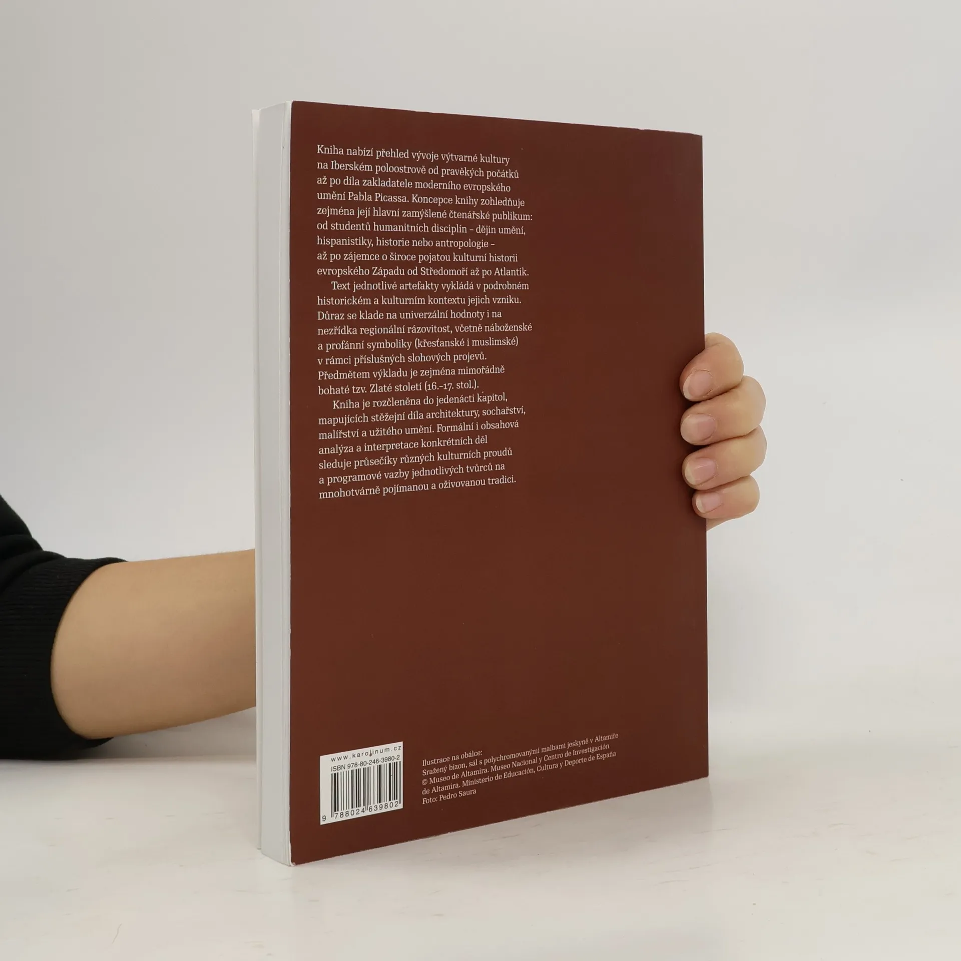 Kniha nabízí přehled vývoje výtvarné kultury na Iberském poloostrově od pravěkých počátků až po díla zakladatele moderního evropského umění Pabla Picassa. Koncepce knihy zohledňuje zejména její hlavní zamýšlené čtenářské publikum: od studentů humanitních disciplín - dějin umění, hispanistiky, historie nebo antropologie - až po zájemce o široce pojatou kulturní historii evropského Západu od Středomoří až po Atlantik. Text jednotlivé artefakty vykládá v podrobném historickém a kulturním kontextu jejich vzniku. Důraz se klade na univerzální hodnoty i na nezřídka regionální rázovitost, včetně náboženské a profánní symboliky (křesťanské i muslimské) v rámci příslušných slohových projevů. Předmětem výkladu je zejména mimořádně bohaté tzv. Zlaté století (16.-17. stol.). Kniha je rozčleněna do jedenácti kapitol, mapujících stěžejní díla architektury, sochařství, malířství a užitého umění. Formální i obsahová analýza a interpretace konkrétních děl sleduje průsečíky různých kulturních proudů a programové vazby jednotlivých tvůrců na mnohotvárně pojímanou a oživovanou tradici.