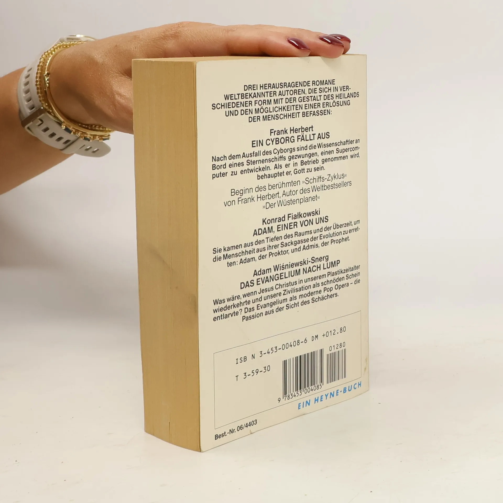 Frank HerbertEin Cyborg fällt aus (Destination Void)Nach dem Ausfall des Cyborgs sind die Wissenschaftler an Bord eines Sternenschiffs gezwungen, einen Supercomputer zu entwickeln. Als er in Betrieb genommen wird, behauptet er, Gott zu sein.Beginn des berühmten >>Schiffs-Zyklus>Der Wüstenplanet<<Konrad FiatkowskiAdam, Einer von uns (Adam, Jeden Z Nas)Sie kamen aus den Tiefen des Raums und der Überzeit, um die Menschheit aus ihrer Sackgasse der Evolution zu erretten: Adam, der Proktor, und Admis, der Prophet.Adam Wisniewski-SnergDas Evangelium nach Lump (Wedlug Lotra)Was wäre, wenn Jesus Christus in unserem Plastikzeitalter wiederkehrte und unsere Zivilisation als schnöden Schein entlarvte? Das Evangelium als moderne Pop Opera - die Passion aus der Sicht des Schächers.Heyne 06/4403