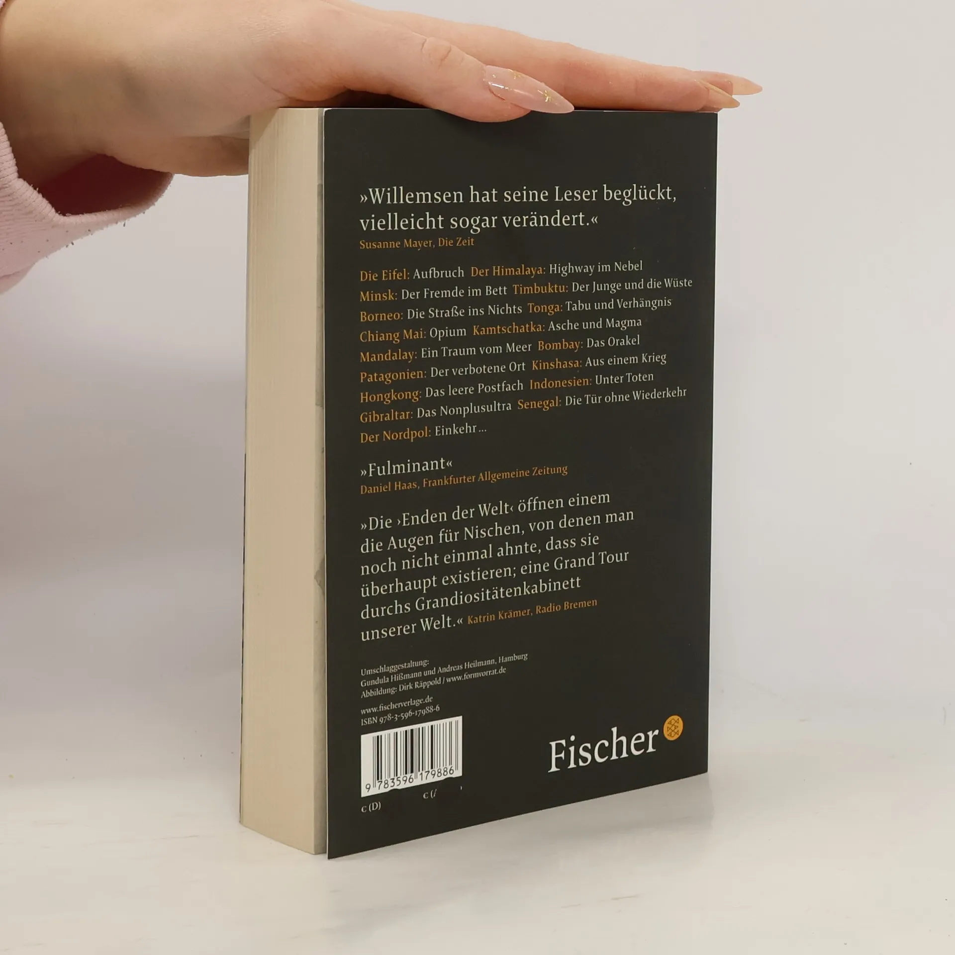 Auf fünf Erdteilen war Roger Willemsen unterwegs, um seine ganz persönlichen Enden der Welt zu finden. Manchmal waren es die großen geographischen: das Kap in Südafrika, Patagonien, der Himalaja, die Südsee, der Nordpol. Manchmal waren es aber auch ganz einzigartige, individuelle Endpunkte: ein Bordellflur in Bombay, ein Bett in Minsk, ein Fresko des Jüngsten Gerichts in Orvieto, eine Behörde im Kongo. Immer aber geht es in diesen grandiosen literarischen Reisebildern auch um ein Enden in anderem Sinn: um ein Ende der Liebe und des Begehrens, der Illusionen, der Ordnung und Verständigung. Um das Ende des Lebens – und um den Neubeginn. Die Eifel: Aufbruch – Der Himalaya: Highway im Nebel – Minsk: Der Fremde im Bett – Timbuktu: Der Junge und die Wüste – Borneo: Die Straße ins Nichts – Tonga: Tabu und Verhängnis – Chiang Mai: Opium – Kamtschatka: Asche und Magma – Mandalay: Ein Traum vom Meer – Bombay: Das Orakel – Patagonien: Der verbotene Ort – Kinshasa: Aus einem Krieg – Hongkong: Das leere Postfach – Indonesien: Unter Toten – Gibraltar: Das Nonplusultra – Senegal: Die Tür ohne Wiederkehr – Der Nordpol: Einkehr …