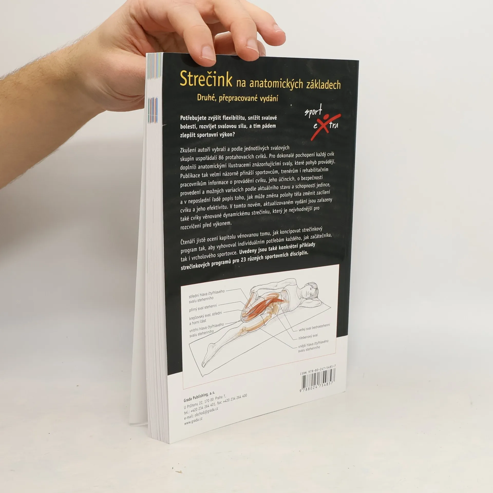 Nové vydání bestselleru, které vám pomůže ke zvýšení ohebnosti, rozvoji svalové síly, snížení svalové bolestivosti, a tím ke zlepšení výkonu ve všech pohybových aktivitách. Autoři vybrali a podle jednotlivých svalových skupin uspořádali 86 protahovacích cviků. Pro dokonalé pochopení každý cvik doplnili anatomickými ilustracemi znázorňujícími svaly, které provádějí pohyb, spolu s okolními strukturami, jako jsou klouby, vazy a šlachy. Všechny svaly jsou popsány česky a pro lepší orientaci a srozumitelnost i latinsky. Publikace tak velmi názorně přináší sportovcům, trenérům i rehabilitačním pracovníkům informace o provádění cviku, jeho účincích, o bezpečnosti provedení a možných variacích podle aktuálního stavu a schopností jedince, a v neposlední řadě popis toho, jak může změna polohy těla změnit zacílení cviku a jeho efektivitu. Nově je do knihy zařazena kapitola věnovaná dynamickému strečinku, který je nejvhodnější pro rozcvičení před výkonem, a další kapitola věnovaná tomu, jak koncipovat strečinkový program tak, aby vyhovoval individuálním potřebám každého, začátečníka i vrcholového sportovce. Uvedeny jsou konkrétní příklady strečinkových programů pro 23 různých sportovních disciplín.